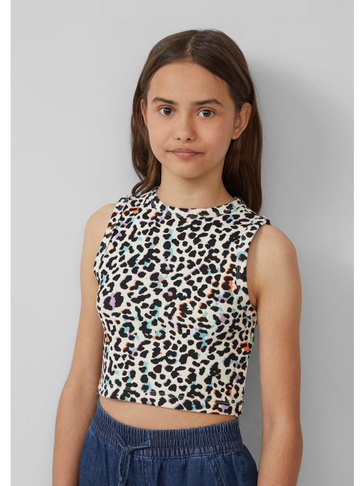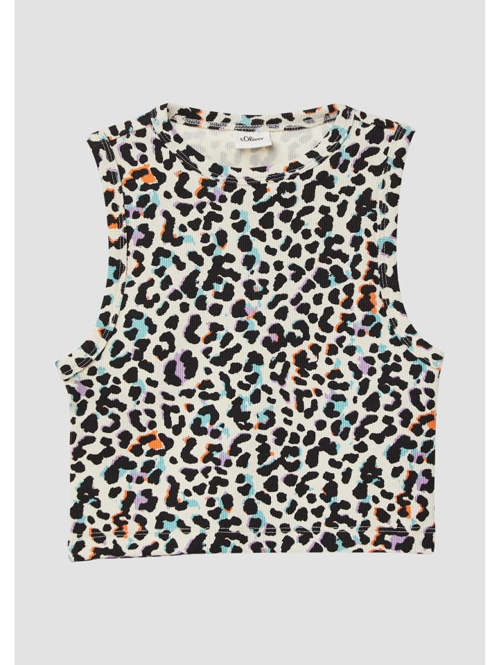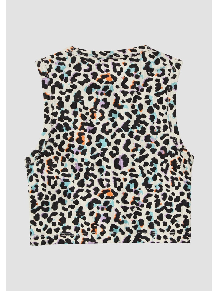 Модный укороченный топ с леопардовым принтом для стильных девчонок! Эта майка из эластичной рубчатой ткани приятна к телу и идеально сидит благодаря облегающему крою. Круглый вырез горловины и широкие бретели создают непринужденный образ. Идеально подходит для летних нарядов или в качестве многослойного элемента.