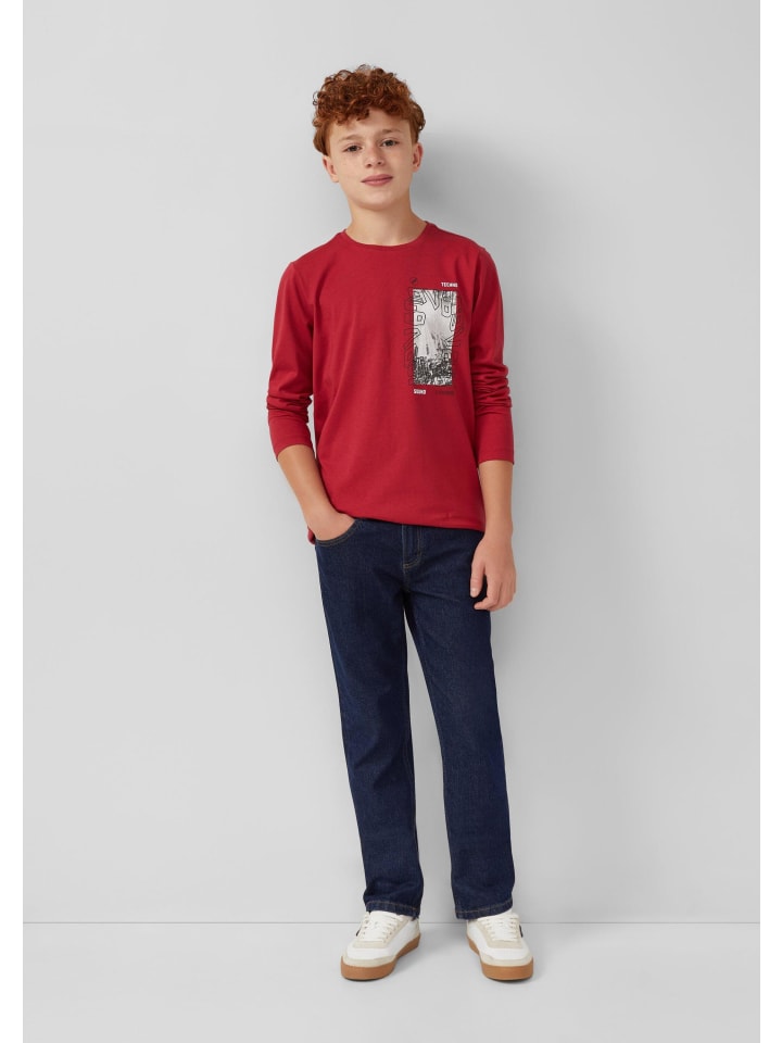 Эта модель с длинными рукавами из мягкого хлопкового трикотажа украшена стильным принтом спереди. Ребристый воротник добавляет особый шарм, а классический крой гарантирует комфорт. Универсальный фаворит для школы, отдыха и уютных домашних дней.
