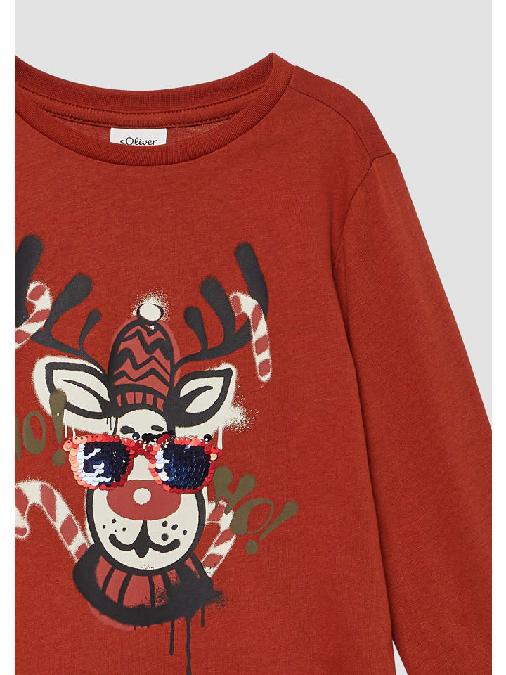 Праздничный топ с длинными рукавами, очаровательным рождественским принтом спереди и сверкающими двусторонними пайетками. Мягкий хлопковый трикотаж с начесом обеспечивает комфортную носку. Зимний компаньон для рождественских праздников и других мероприятий.