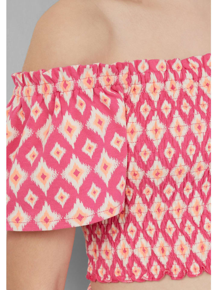 Повседневный топ со сборками для маленьких модниц! Этот укороченный трикотажный топ из мягкого хлопка отличается игривым вырезом с открытыми плечами и милыми оборками на рукавах. Сплошной принт и сборка придают ему летний вид. Идеально подходит для теплых дней и стильных нарядов вашей дочери.