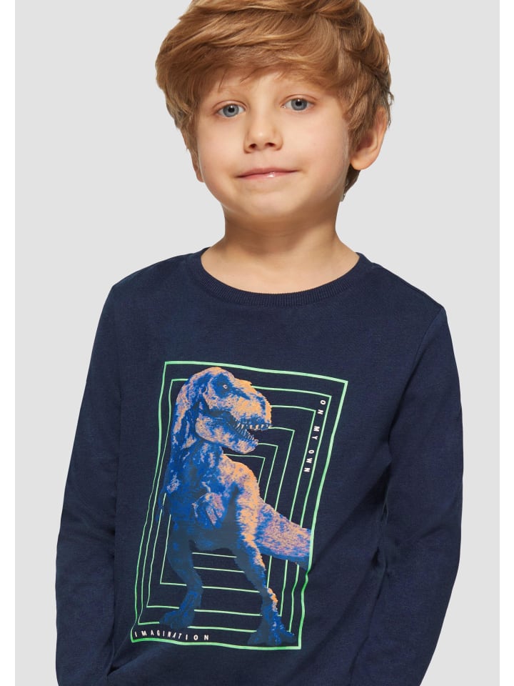 Вниманию поклонников динозавров! Эта футболка с длинными рукавами из 100% хлопка украшена стильным принтом спереди. Вырез горловины и классический крой обеспечивают комфорт. Идеально подходит для игр в детском саду или уютных домашних вечеров. Универсальная базовая модель для маленьких исследователей!