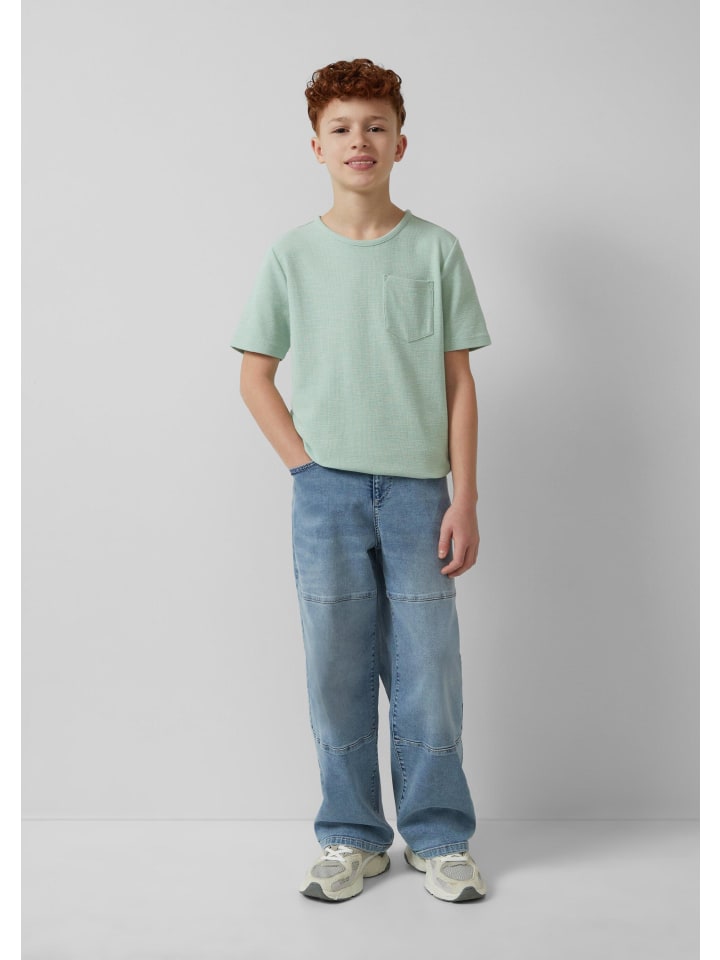 Футболка из хлопковой смеси для активных детей! Классический крой и короткие рукава обеспечивают свободу движений во время игры. Нагрудный карман удобен для маленьких сокровищ. Круглый вырез горловины и декоративная отделка создают непринужденный образ. Идеально подходит для летних дней и прогулок!
