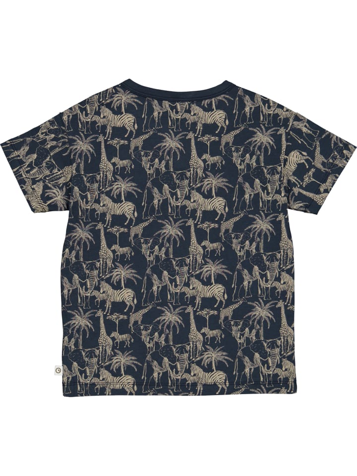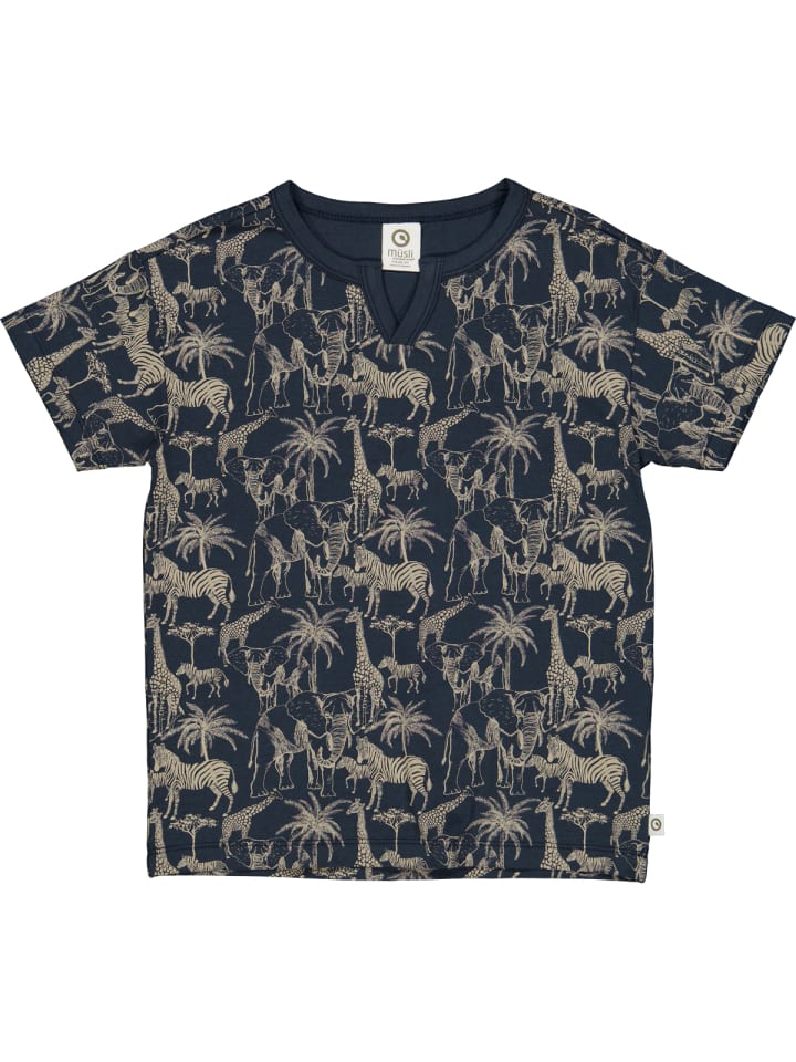 Эта футболка украшена нежным принтом животных саванны по всей поверхности, вдохновленным сафари. Принт выполнен в светло-бежевых тонах на темно-синем фоне. Футболка имеет V-образный вырез спереди и ребристые манжеты. Этот вырез добавляет интересную деталь и позволяет легко надевать и снимать футболку. Футболка из однотонного джерси с эластаном обеспечивает удобную посадку и высокую прочность. Ткань обеспечивает приятный комфорт и полную свободу движений. Эта футболка идеально подходит для повседневной носки и легко сочетается с различными нарядами. Она предлагает хорошее сочетание стиля и функциональности и идеально подходит для активных дней. GOTS - Organic Standard. Сертифицировано Ecocert Greenlife Lic. № 151714. Этот продукт сертифицирован GOTS - Organic. В настоящее время это самый высокий стандарт для одежды. Все производственные процессы, такие как окрашивание, ткачество и шитье, осуществляются в соответствии со строжайшими правилами с учетом охраны окружающей среды. Условия труда строго контролируются на каждом этапе производства. Хлопок 95%, эластан 5%