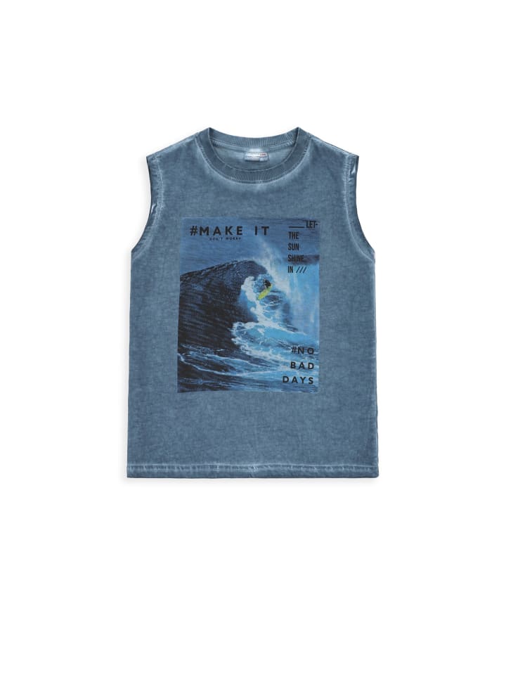 Футболка без рукавов для мальчиков. Принт спереди. Круглый вырез горловины. Эта очаровательная футболка без рукавов из коллекции NEW WAVE JUNIOR сделает летние дни еще ярче и веселее! На передней стороне футболки изображен динамичный принт с серфером, рассекающим волны. Без рукавов и свободный крой делают эту футболку идеальной для жарких дней, позволяя вашему мальчику двигаться комфортно и свободно, наслаждаясь летними развлечениями.