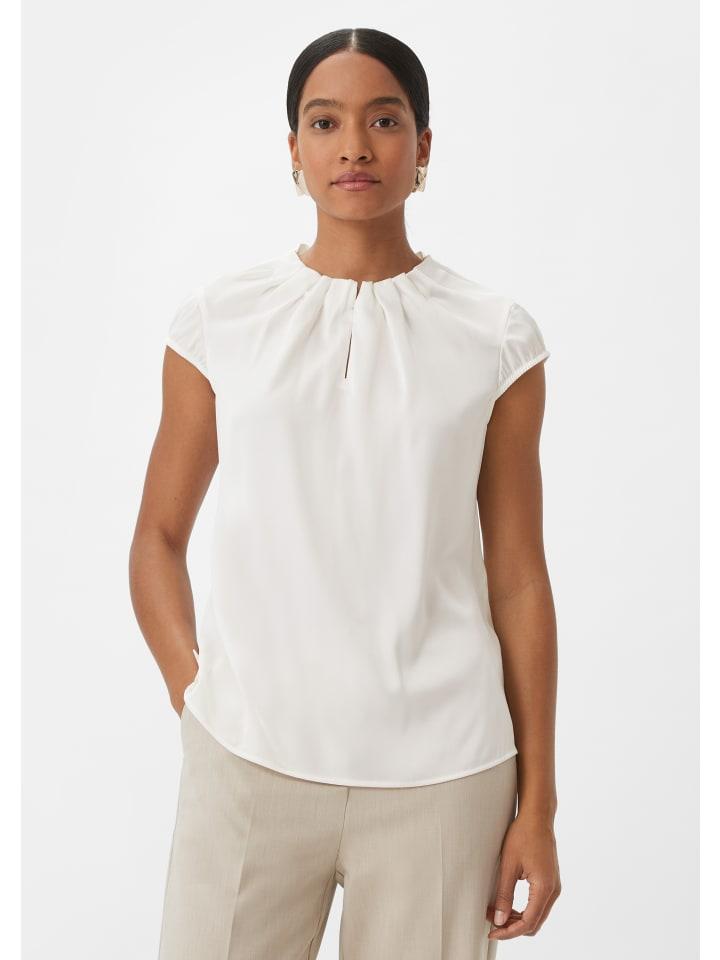 Элегантная легкость атласа: эта блузка с изысканными деталями, такими как боковые разрезы и застежка на пуговицы, выгодно подчеркнет вашу фигуру. Благодаря мягкой ткани и свободным рукавам-крылышкам, она станет легким и легким базовым вариантом как для деловых, так и для повседневных образов. Носите ее по своему вкусу, чтобы создать женственный и современный образ.