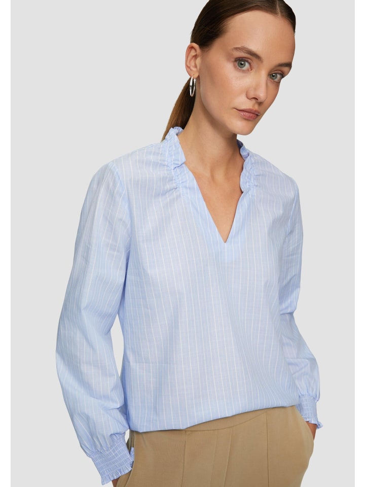 Вневременные полоски, современные детали: эта хлопковая блузка - ваш универсальный спутник как для повседневных, так и для деловых мероприятий. V-образный вырез и присборенные детали придадут вам уверенный вид. Благодаря прямому крою и поплиновой ткани она идеально подчеркивает вашу фигуру. Носите ее с уверенностью - от встреч до ужинов после работы.