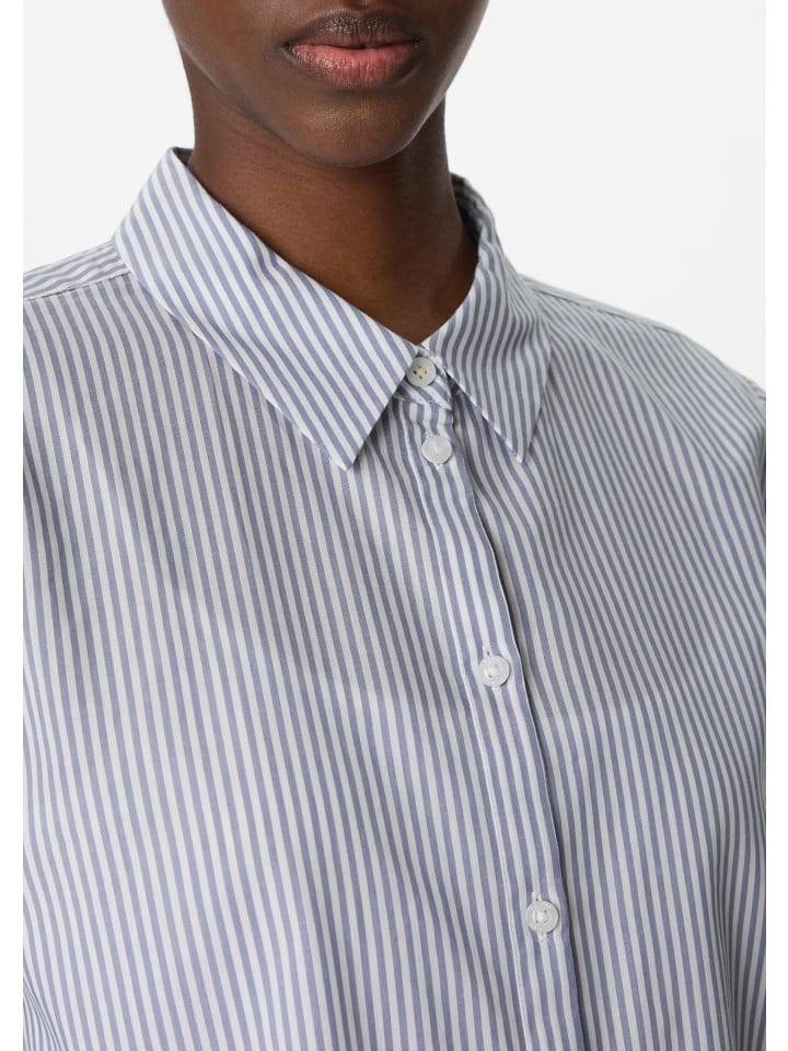 Откройте для себя полосатую блузку-рубашку с изысканной отделкой рукавов - классика в новом прочтении. Прямой крой подчеркивает фигуру, а рубашечный воротник и планка на пуговицах создают элегантный деловой образ. Манжеты и разрез на рукавах добавляют современный штрих. Носите блузку по-разному: в офисе или в повседневной жизни в выходные. Закругленный низ идеально дополняет дизайн.