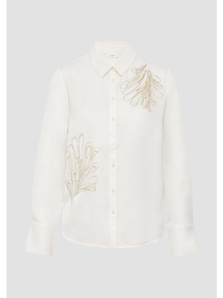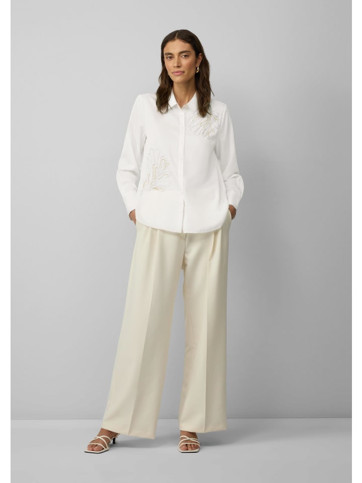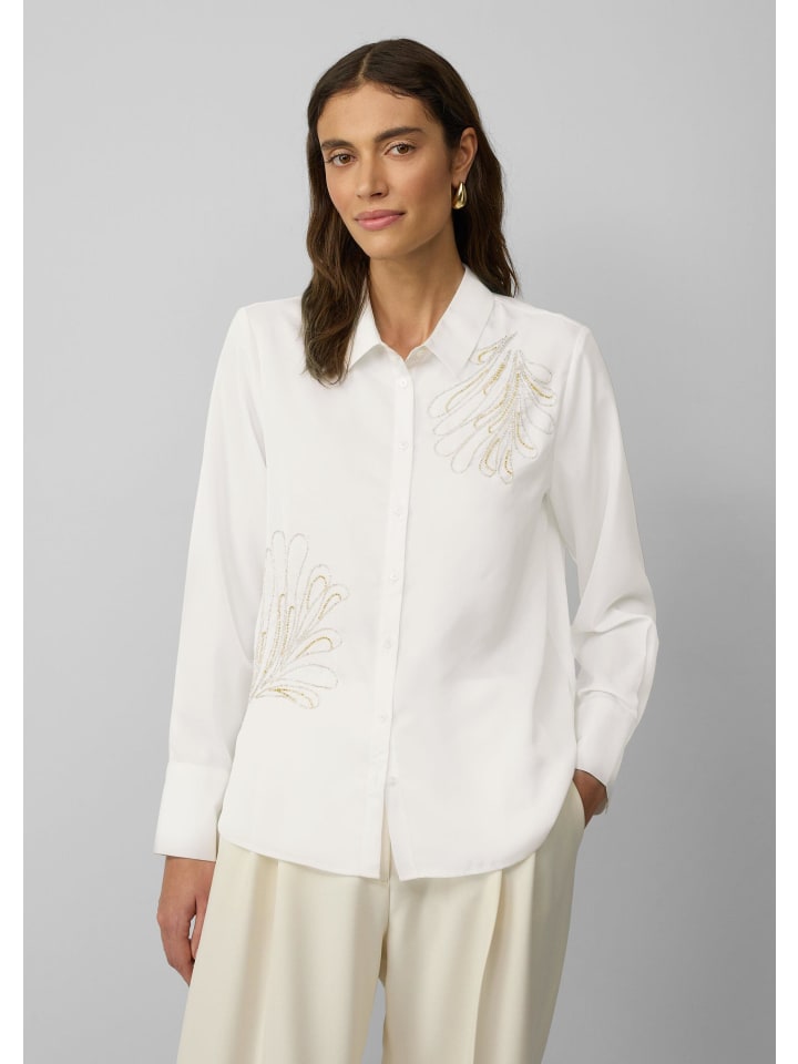 Струящаяся блузка-рубашка, которая производит ошеломляющее впечатление: аппликация из 3D-бусин идеально подчеркивает фигуру. Прямой крой и классический рубашечный воротник сочетают комфорт и стиль. Эта блузка станет вашим универсальным спутником на все случаи жизни, будь то офис или вечернее мероприятие. Мягкая ткань обеспечивает легкую драпировку и непринужденный стиль.