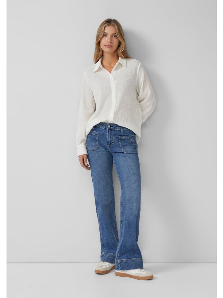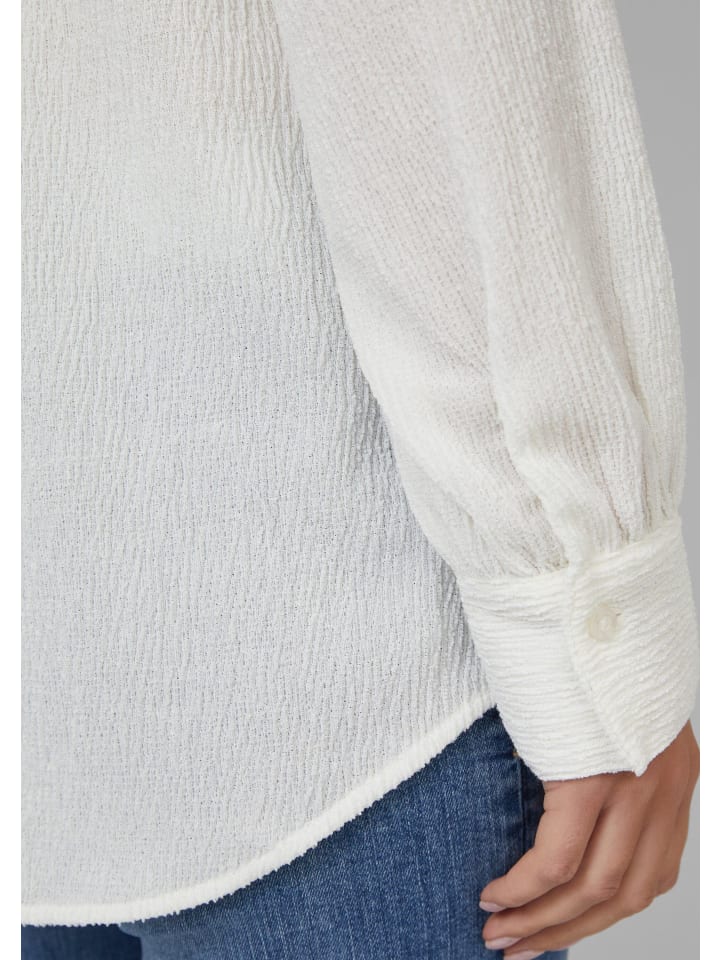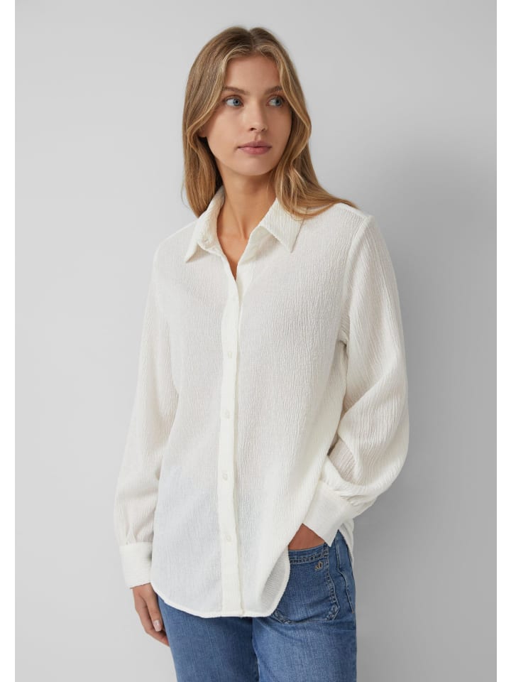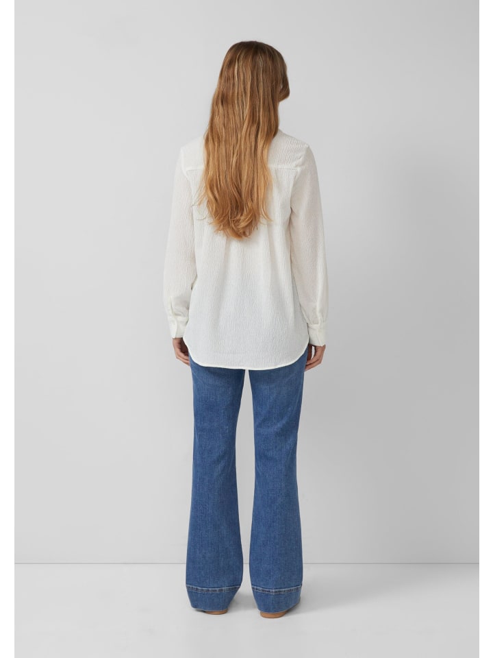 Эта женственная трикотажная блузка из текстурированной эластичной ткани впечатляет изысканной спинкой и удлиненным подолом. Классический рубашечный воротник и манжеты придают ей вневременную элегантность и делают ваш повседневный образ незабываемым.