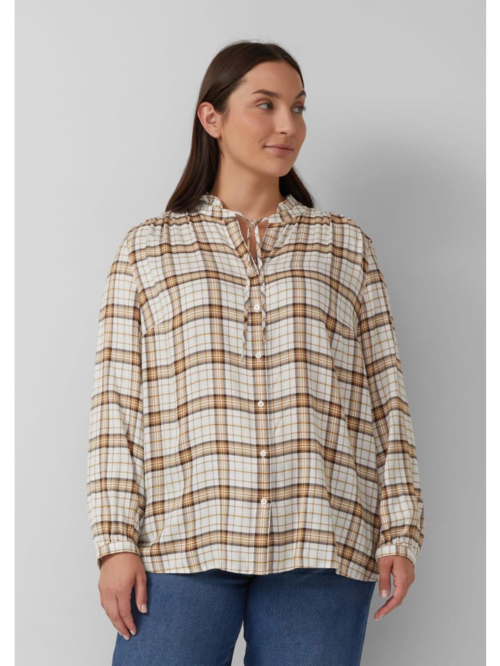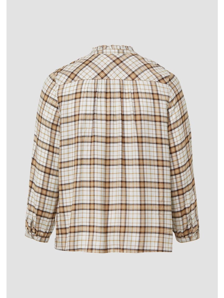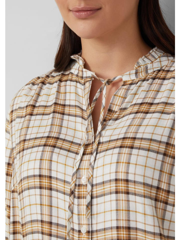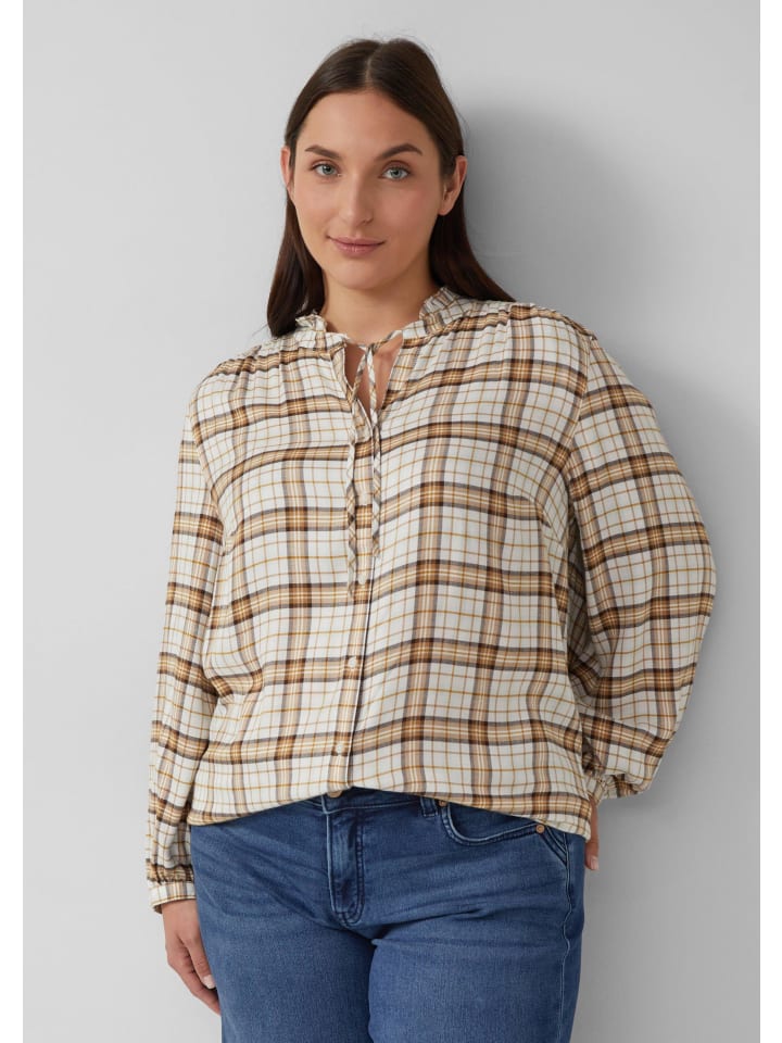 Эта клетчатая блузка свободного кроя с оборкой притягивает взгляды благодаря игривому воротнику. Струящаяся ткань обеспечивает комфорт, а длинные рукава с манжетами и разрезами добавляют женственности. Идеально подходит для расслабленных дней, когда вы просто хотите чувствовать себя хорошо!
