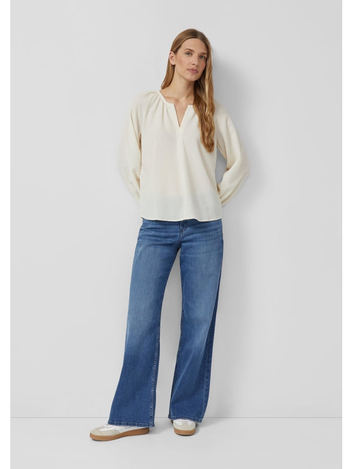 Эта эластичная блузка структурированного кроя с широкими рукавами сочетает в себе комфорт и женственную элегантность. V-образный вырез и изящные манжеты добавляют стильные акценты, а свободный крой обеспечивает максимальную свободу движений в повседневной жизни.