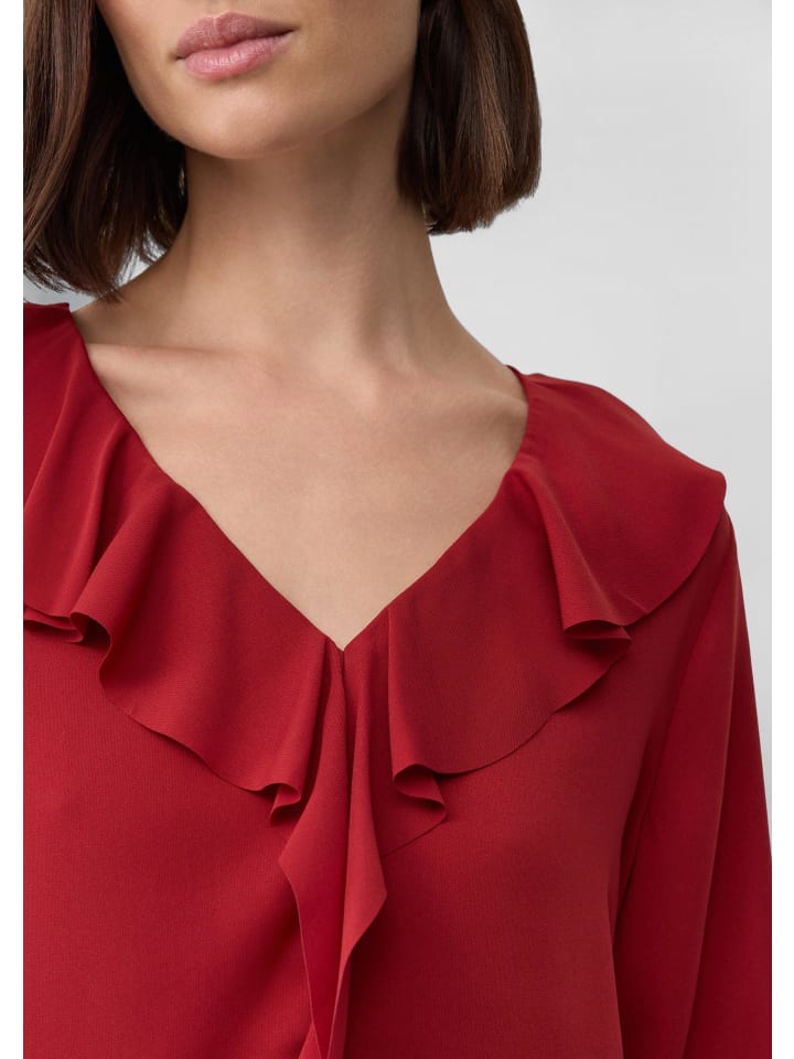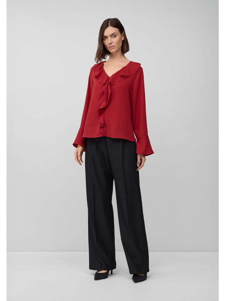 Женственная элегантность в сочетании с современным деловым стилем: эта блузка с воланами из струящегося крепа впечатляет изысканным V-образным вырезом и элегантными манжетами. Прямой крой и игривые оборки создают идеальный баланс между офисным стилем и праздничным шармом. Универсальная модель для создания уверенного образа.