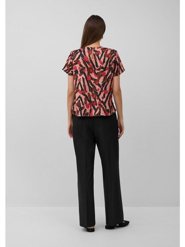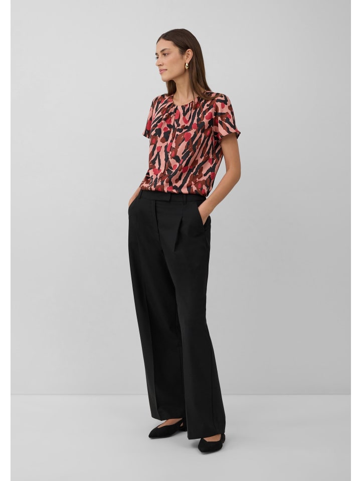 Блузка с короткими рукавами, сборками и планкой - эффектный предмет гардероба, сочетающий элегантность и индивидуальность. Высокий вырез горловины с разрезом, пуговицей и изысканными складками придаст вам уверенный вид. Струящийся атлас сочетается с графическим принтом по всей поверхности: идеально подходит для деловых встреч, ужинов и отдыха. Эта блузка прямого кроя с коротким рукавом подчеркнет ваш стиль - бескомпромиссный, универсальный и вневременной. Носите ее с уверенностью, куда бы вы ни отправились.