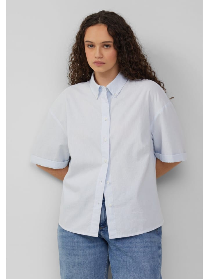 Воздушная и легкая блузка свободного кроя для повседневного образа! Хлопковый поплин в полоску обеспечит комфорт в теплые дни. Отложной воротник на пуговицах и спущенные плечи идеально подходят для расслабленного отдыха.