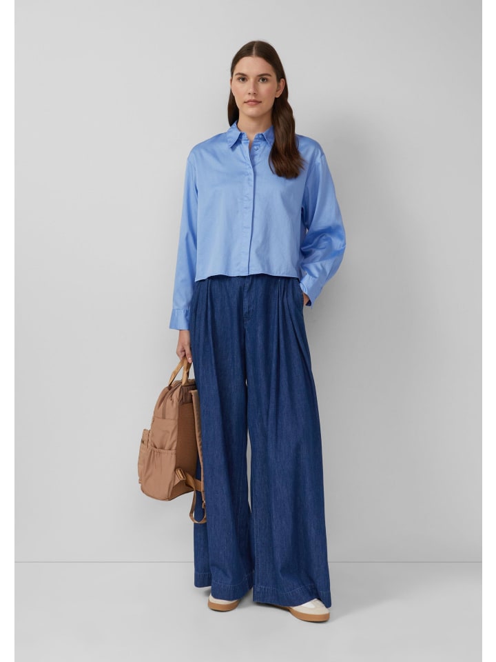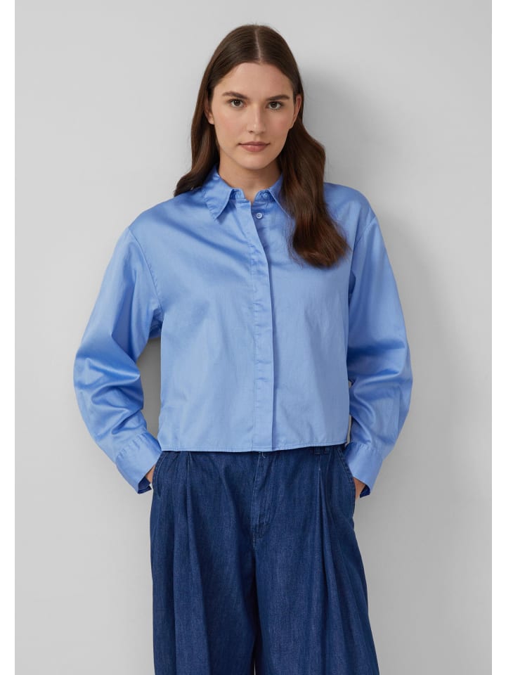 Эта укороченная блузка свободного кроя с классическим рубашечным воротником и спущенными плечами. Потайная застежка на пуговицы и приталенные манжеты рукавов придают образу особую непринужденность.