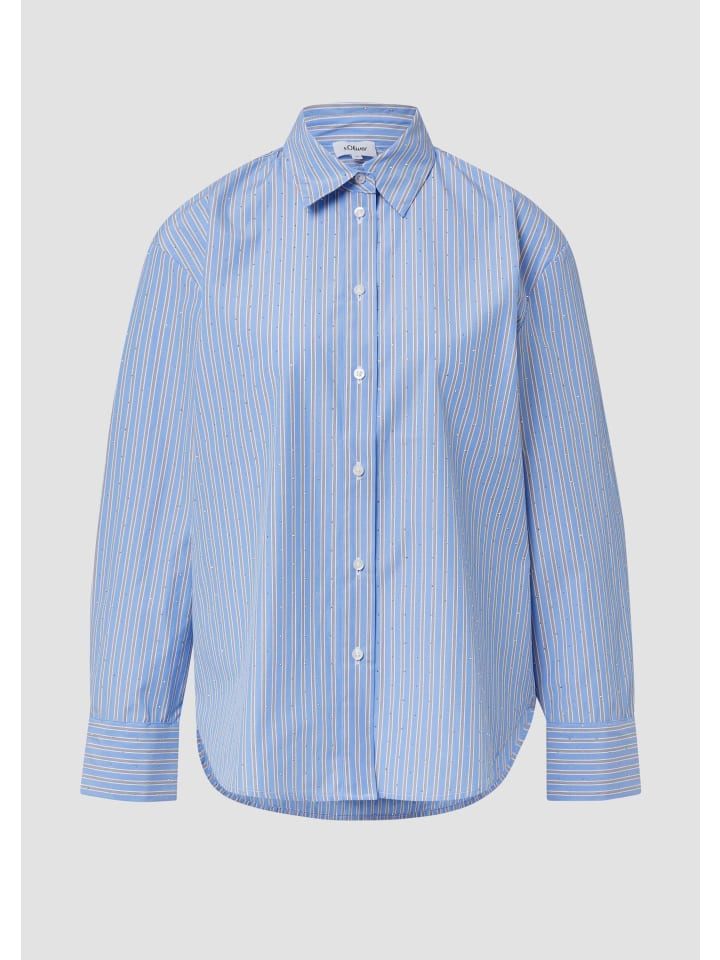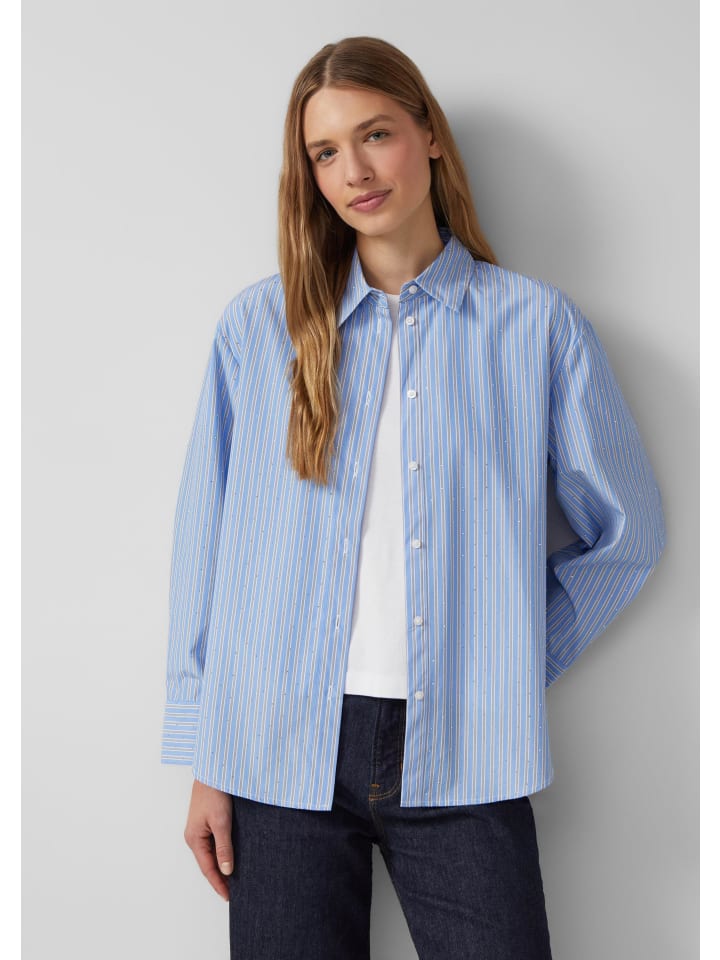 Полосатая блузка-рубашка с эффектом «вау!» Свободный крой и спущенные плечи создают непринужденный образ, а стразы добавляют сверкающие акценты. Универсальный спутник на каждый день - от офиса до ужина.