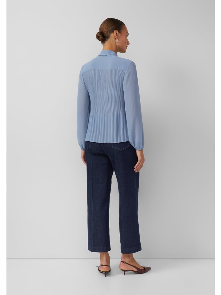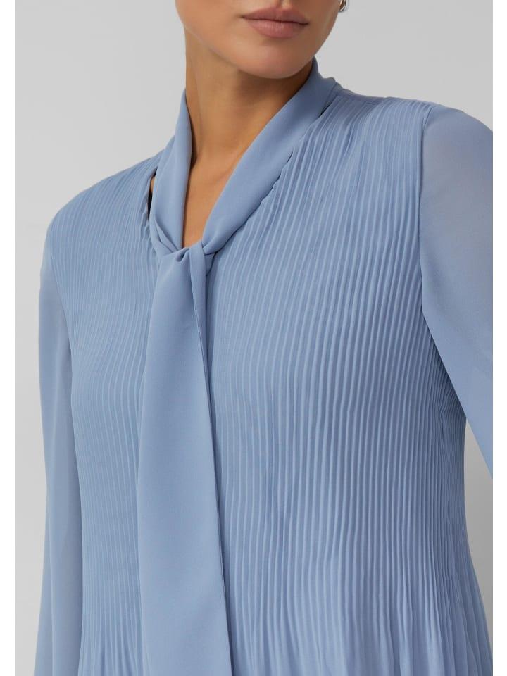 Плиссированный шифон сочетается с женственной утонченностью - эта блузка с бантом и воротником-стойкой станет воплощением непринужденной элегантности. V-образный вырез и завязывающийся пояс добавляют изящные акценты, а классический крой обеспечивает струящийся силуэт. Длинные рукава с эластичными манжетами дополняют современный образ. Наденьте ее на деловую встречу или ужин - и подчеркните свой индивидуальный стиль с непреходящей элегантностью.