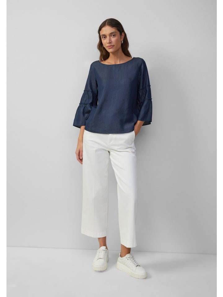 Эта блузка из джинсовой ткани сочетает в себе свободный крой и элегантные рукава-воланы, создавая неповторимый образ. Высококачественная лиоцелловая ткань и изысканные оборки делают ее универсальным спутником - от деловых встреч до неформальных ужинов. Эффектная вещь, идеально сочетающая в себе комфорт и стиль.