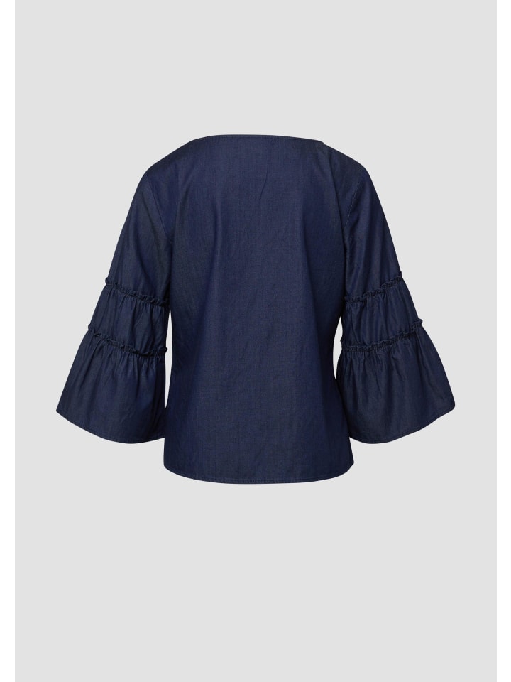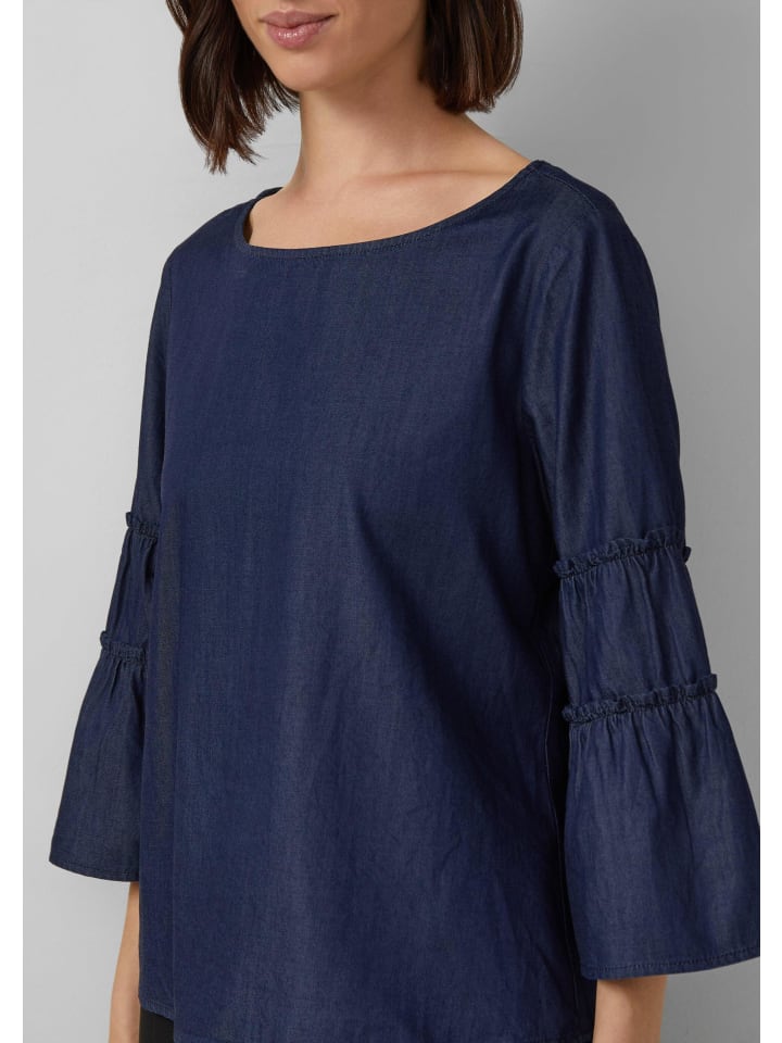 Повседневная элегантность в сочетании с изысканными деталями: эта блузка из денима впечатляет женственными рукавами с воланами и свободным кроем. Современный крой с игривыми оборками делает ее универсальным спутником - как в офисе, так и на неформальном ужине. Вы можете легко сочетать ее с джинсами или классическими брюками, выбирая вневременной стиль с индивидуальностью. Образ, который прослужит долго.