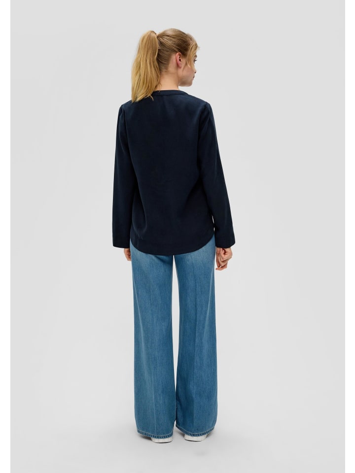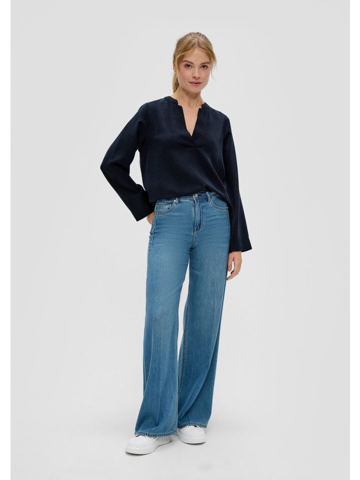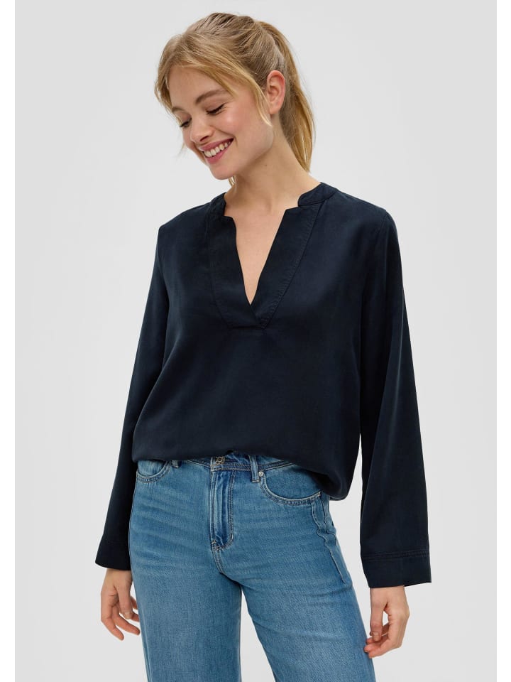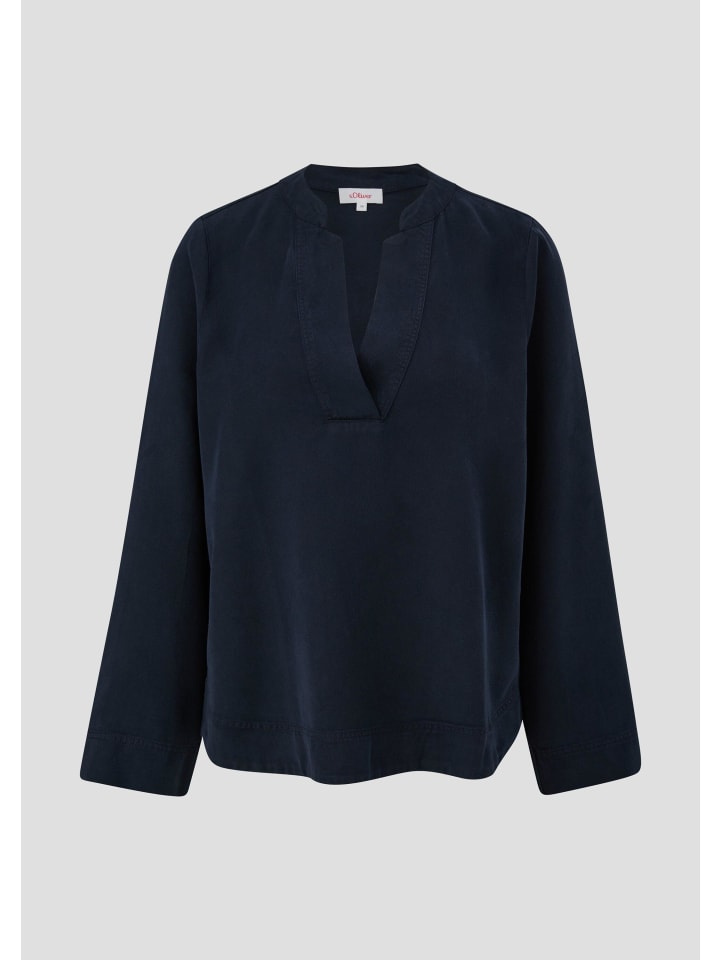 Эта женственная блузка из лиоцелла с V-образным вырезом и воротником-стойкой впечатляет тонкой тканью и элегантно удлиненным подолом сзади. Классический крой и длинные рукава делают ее универсальным повседневным аксессуаром.