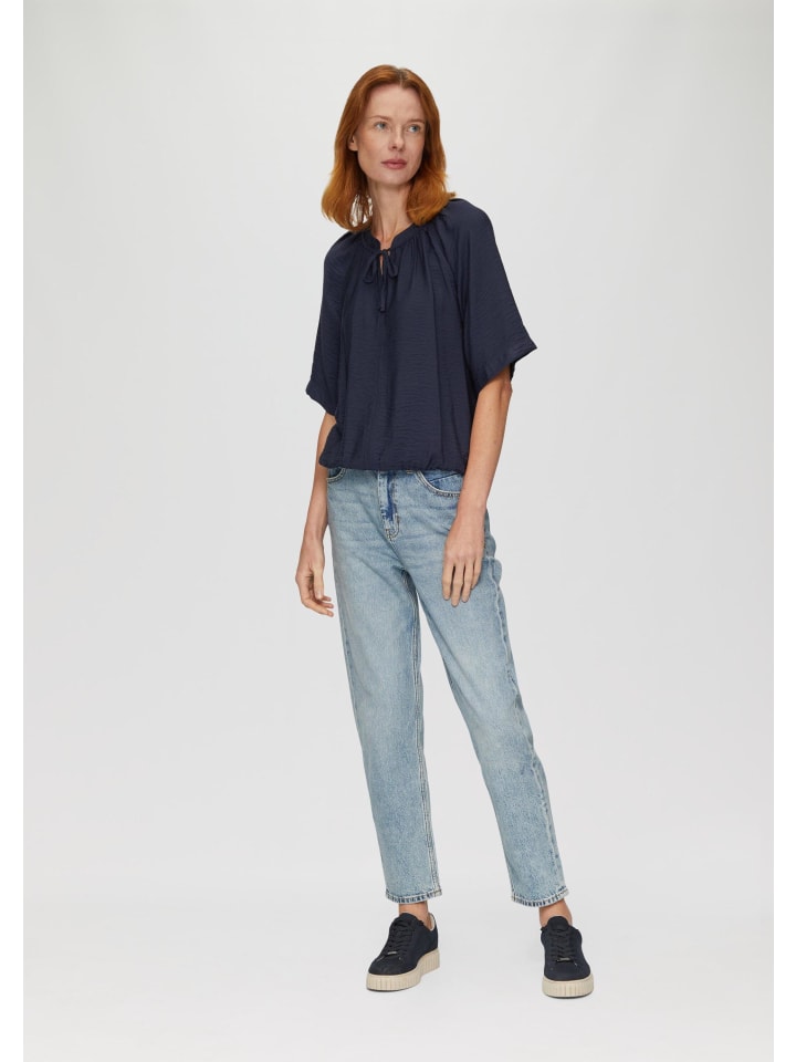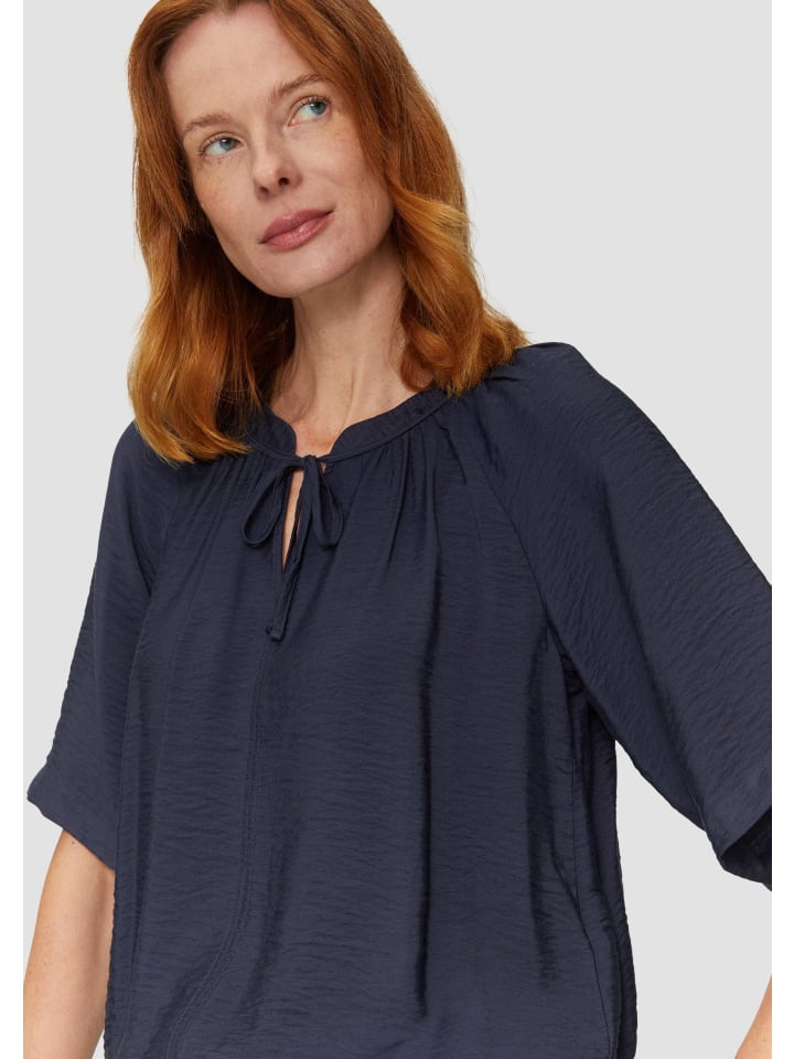 Эта женственная блузка О-образного силуэта сочетает в себе непринужденный комфорт и изысканный стиль. Эластичный подол и свободный крой сочетаются с элегантными сборками и женственным воротником-стойкой. Завязывающийся пояс позволяет создать индивидуальный образ.