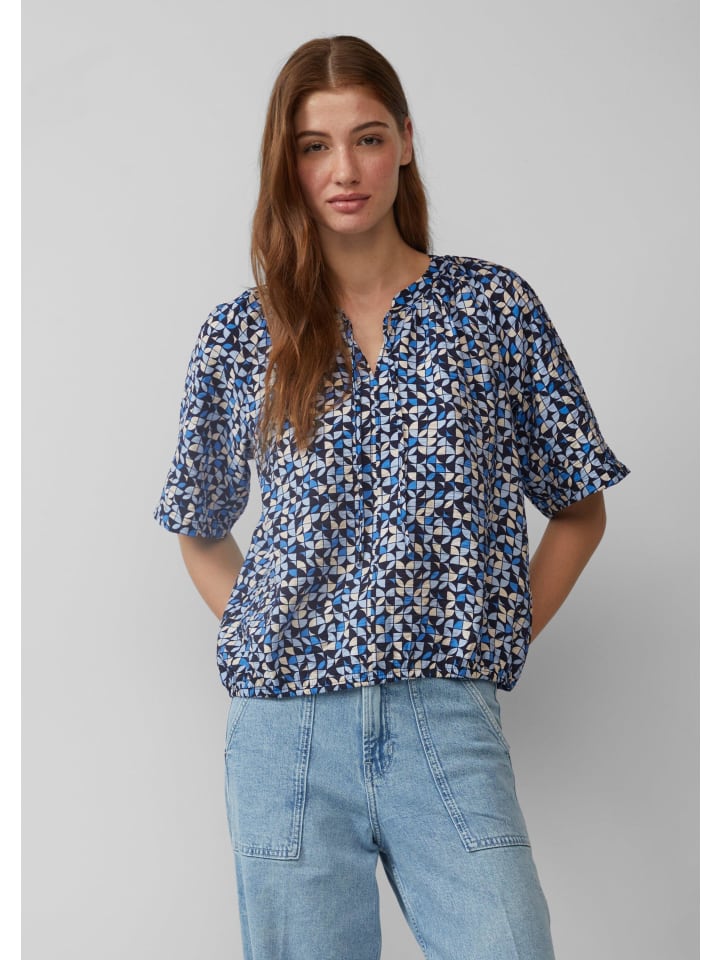 Эта женственная блузка с нежным принтом по всей поверхности и рукавами реглан очаровывает своей воздушной, легкой текстурой. Элегантный воротник-стойка с бантом и эластичный подол создают непринужденный, но стильный образ на каждый день.