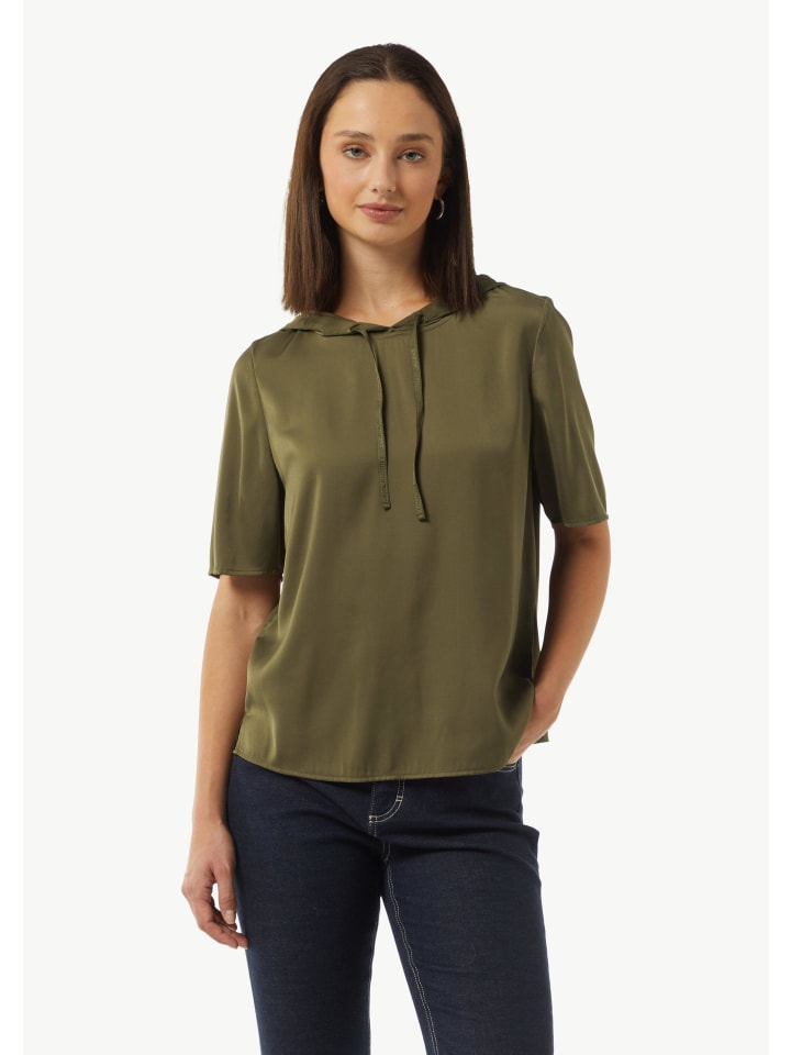 Блузка с капюшоном с изюминкой: эта повседневная модель с короткими рукавами из смеси атласа и вискозы сочетает в себе комфорт и стиль. Приятная на ощупь вискоза, а атласная отделка добавит элегантности. Идеально подходит для повседневной носки или для расслабленного вечера - сочетайте блузку с джинсами для создания непринужденного и шикарного образа или с элегантными брюками для создания нотки изысканности.