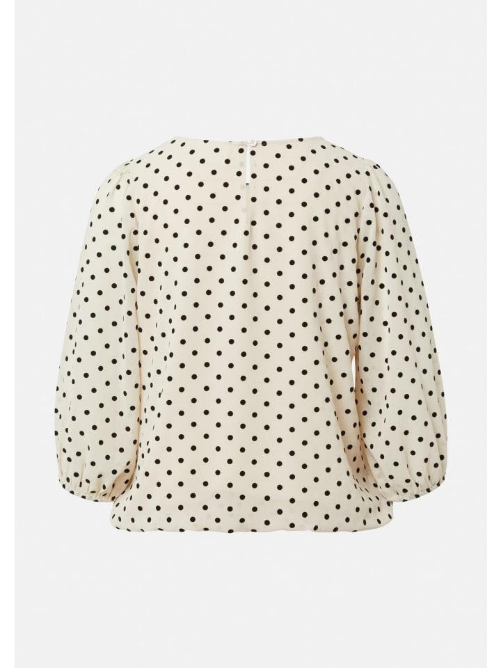 В тренде: эта шифоновая блузка в горошек сочетает в себе легкость и стиль. Круглый вырез с разрезом и застежкой на пуговицу добавляет женственности, а эластичный подол создает привлекательный силуэт. Рукава три четверти делают эту модель идеальным дополнением для любого сезона. Сочетайте блузку с узкими брюками для элегантного офисного образа или с джинсами для повседневного стиля.