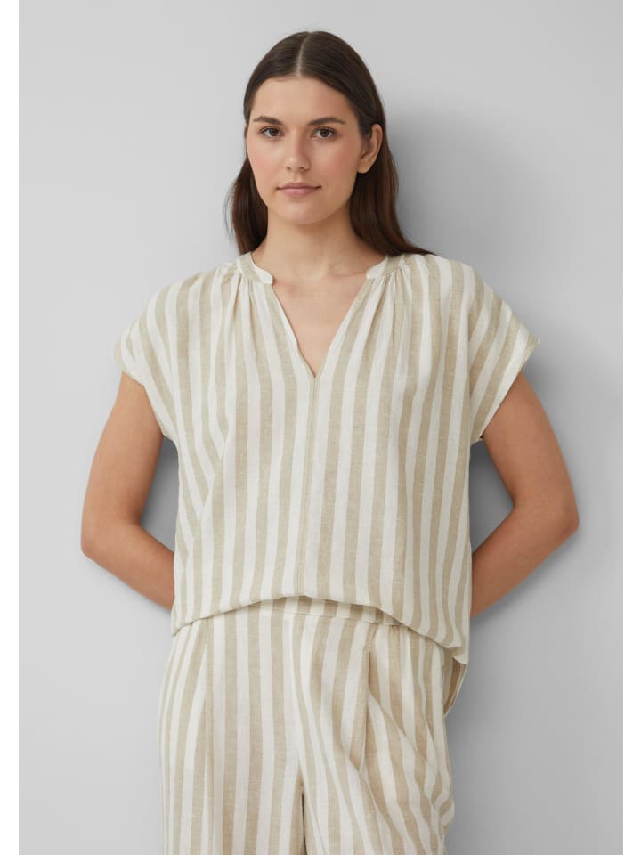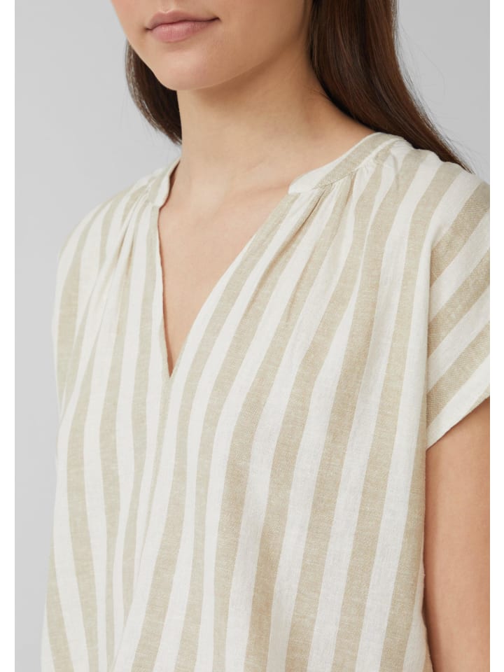 Эта воздушная, легкая блузка свободного кроя сочетает в себе комфорт и стиль. Струящаяся льняная ткань с рюшами и V-образным вырезом делает ее идеальным спутником для расслабленных летних дней - будь то в полоску или однотонная модель.