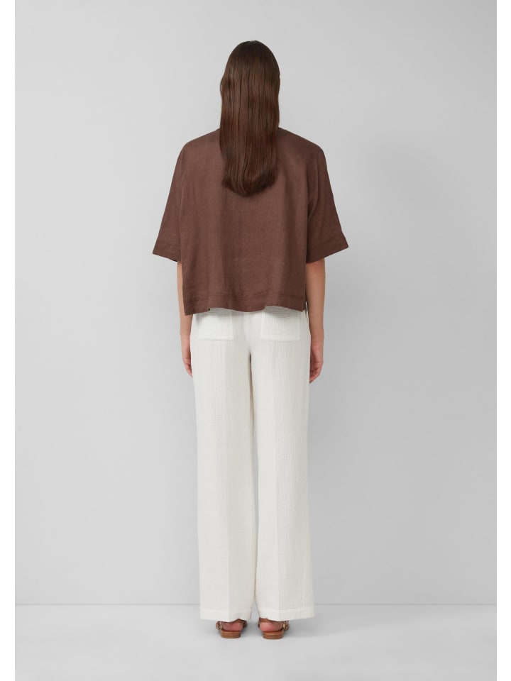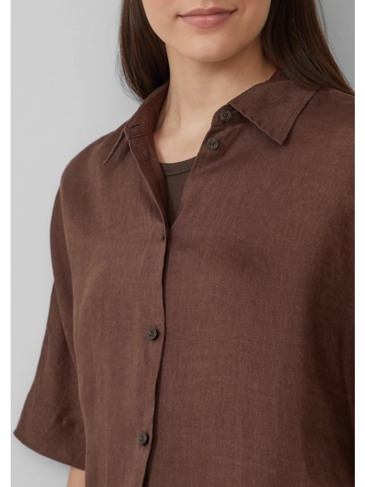 Легкая и воздушная льняная блузка для расслабленных летних дней. Эта блузка с короткими рукавами, свободным кроем, классическим рубашечным воротником и практичной планкой на пуговицах идеально подходит для вашего повседневного образа. Струящаяся ткань обеспечивает комфортную носку.