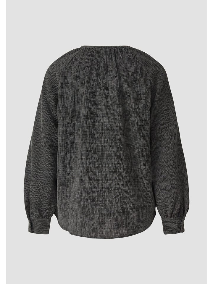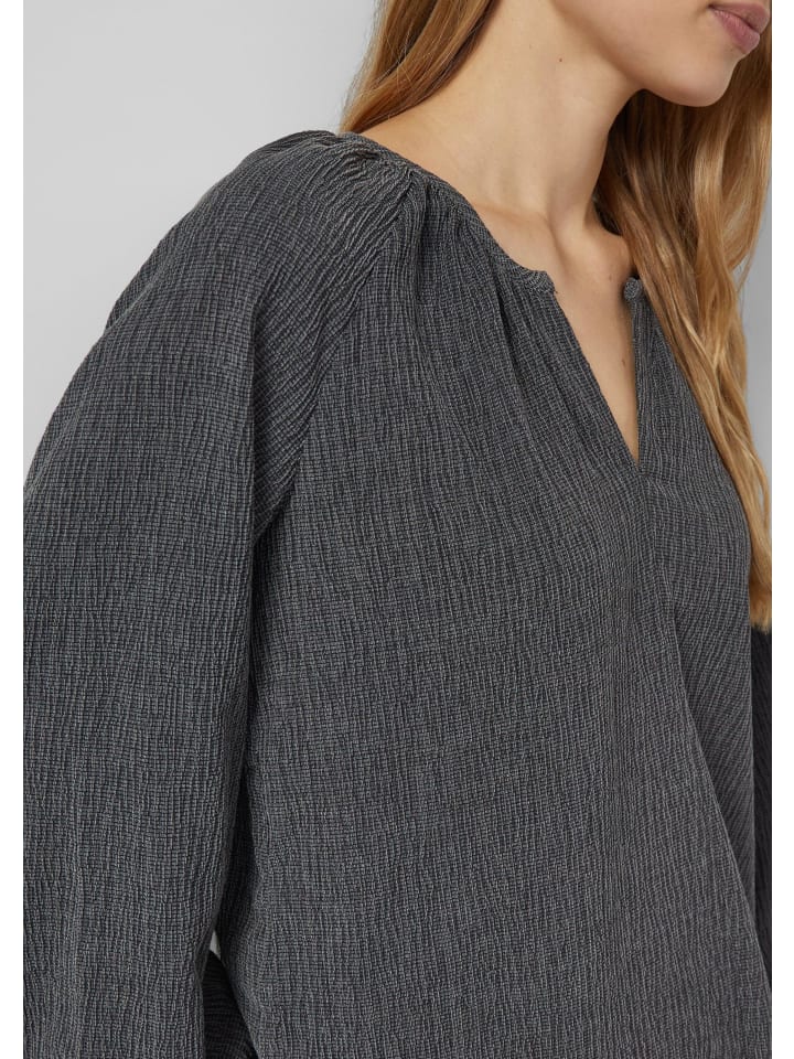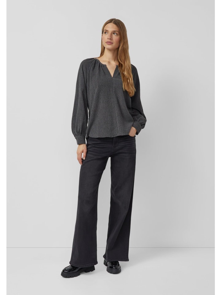 Эта эластичная блузка структурированного кроя с широкими рукавами сочетает в себе комфорт и женственную элегантность. V-образный вырез и изящные манжеты добавляют стильные акценты, а свободный крой обеспечивает максимальную свободу движений в повседневной жизни.