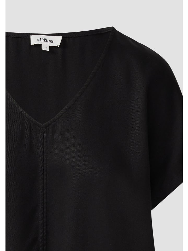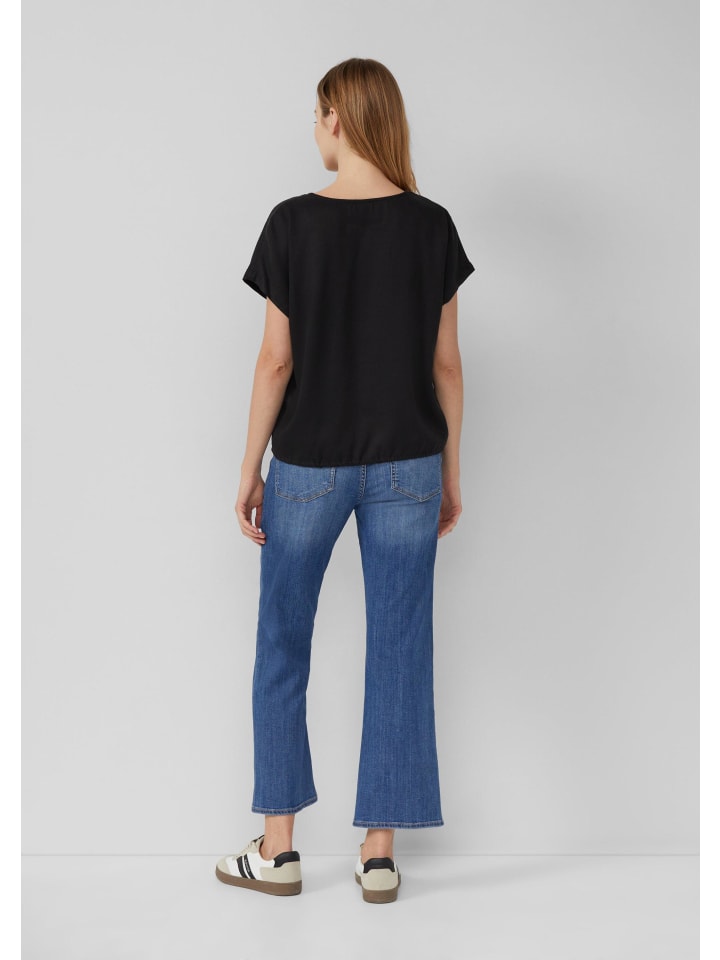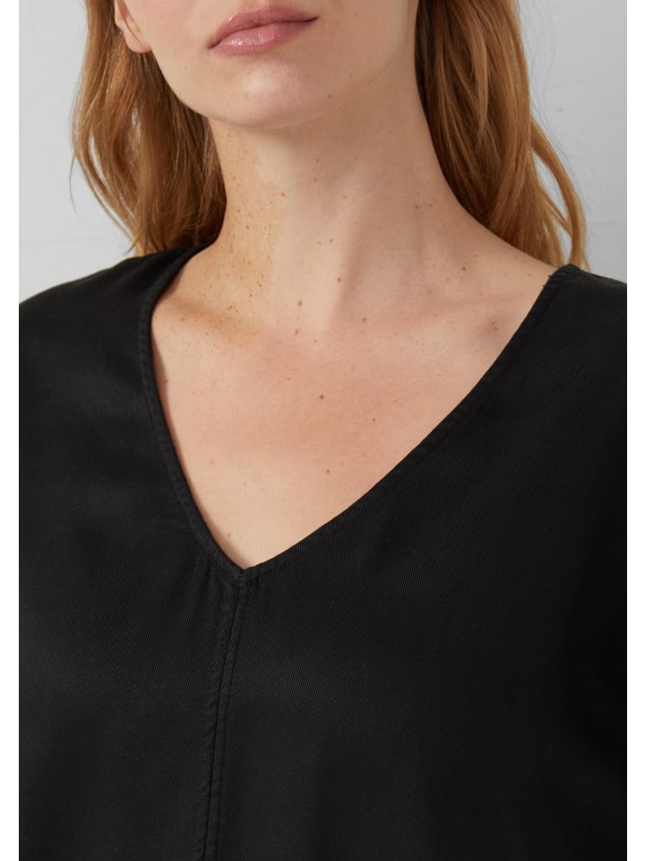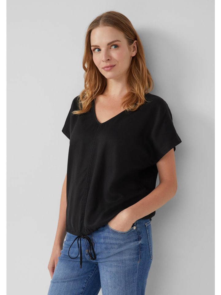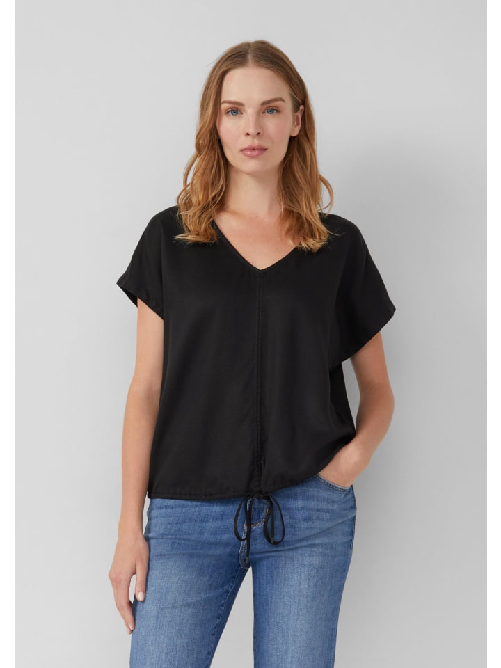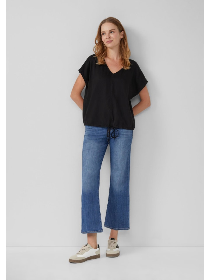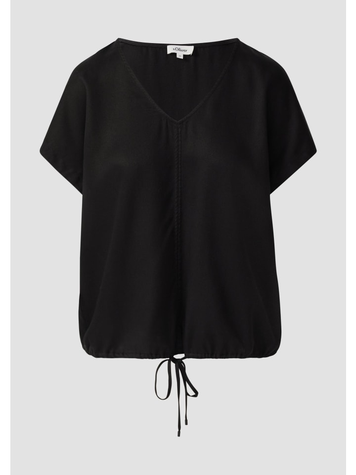 Эта женственная блузка из лиоцелла свободного кроя впечатляет струящейся драпировкой и V-образным вырезом. Практичный низ на шнурке и отсутствие рукавов со спущенным плечом делают ее идеальным спутником для расслабленных летних дней.