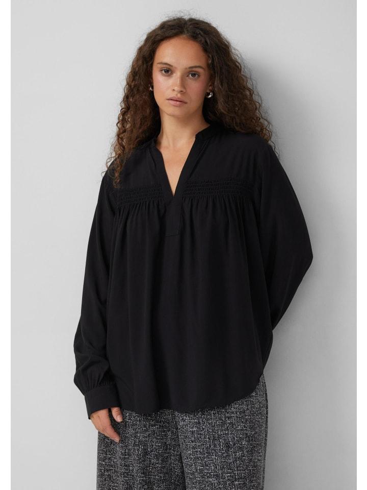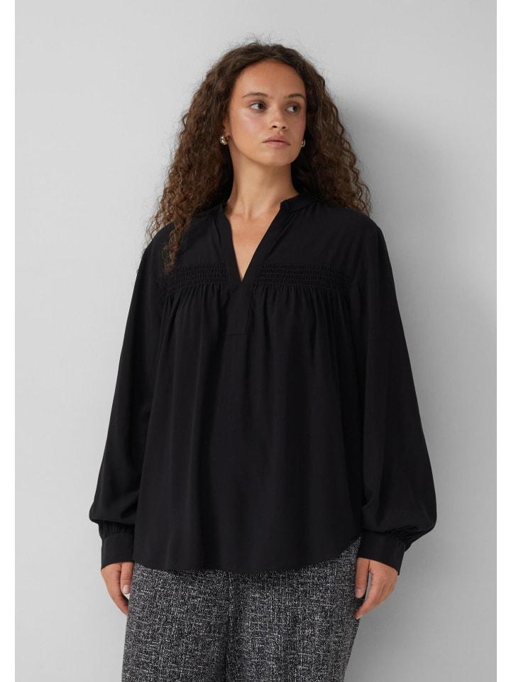 Эта женственная вискозная блузка сочетает в себе непринужденный, повседневный стиль и элегантные детали. Воротник-стойка, присборенные детали и струящийся поплин сделают ее идеальным спутником - как в офисе, так и за бокалом вина после работы.