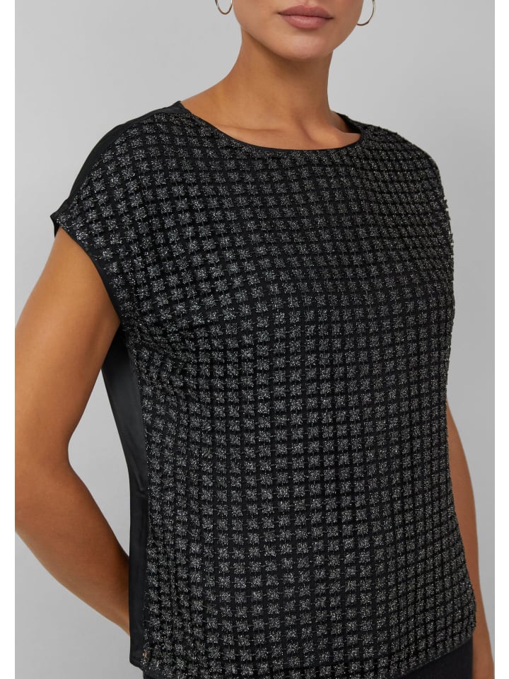 Эксклюзивное сочетание тканей и сверкающего кружева - эта блузка производит яркое впечатление и идеально подходит как для деловых, так и для праздничных случаев. Вырез «лодочка» элегантно подчеркивает декольте, а блестящая пряжа добавляет утонченную изысканность. Прямой крой с 3D-эффектом: образ, который подчеркивает вашу универсальность и излучает уверенность, где бы вы ни находились.