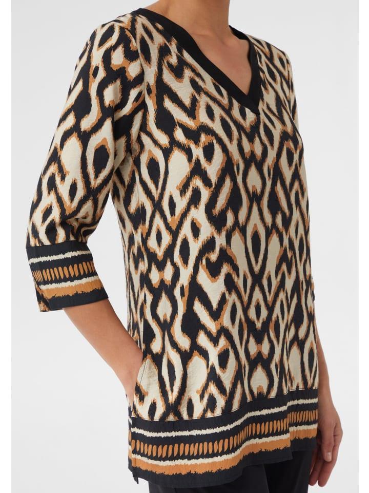 Откройте для себя женственную элегантность в нашей блузке-тунике с принтом по всей поверхности. V-образный вырез и рукава три четверти с манжетами добавят изысканности вашему образу. Декоративная отделка создаст стильные акценты, а свободный крой обеспечит комфорт. Эта длинная блузка из высококачественной ткани универсальна и идеально подходит как для повседневной офисной работы, так и для непринужденного отдыха.