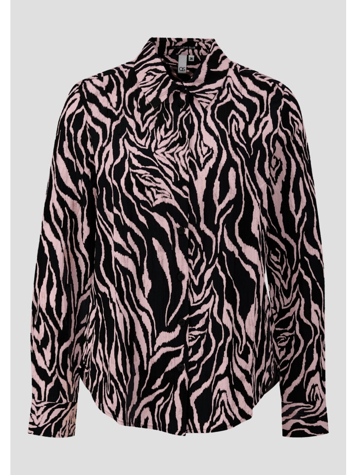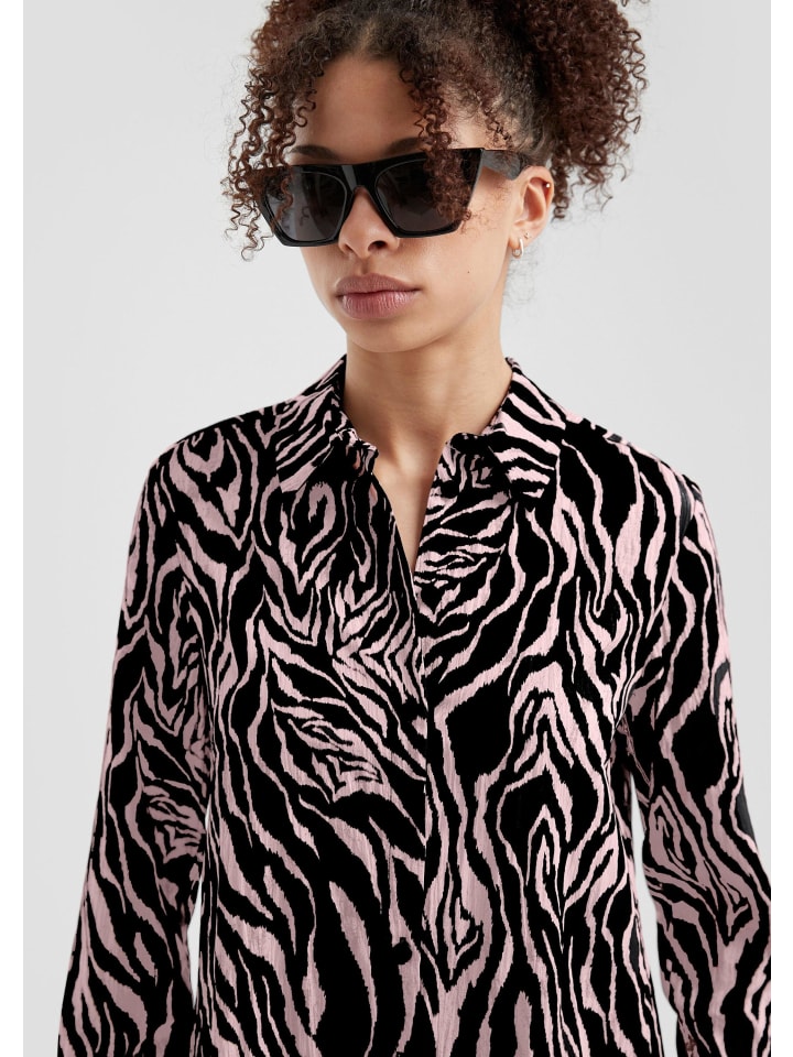 Вискозная блузка с узором для повседневной жизни. Благодаря отложному воротнику и планке на пуговицах она легко сочетается с любым образом. Сплошной принт и закругленный подол делают ее стильным акцентом. Идеально подходит для расслабленных дней и повседневных образов.