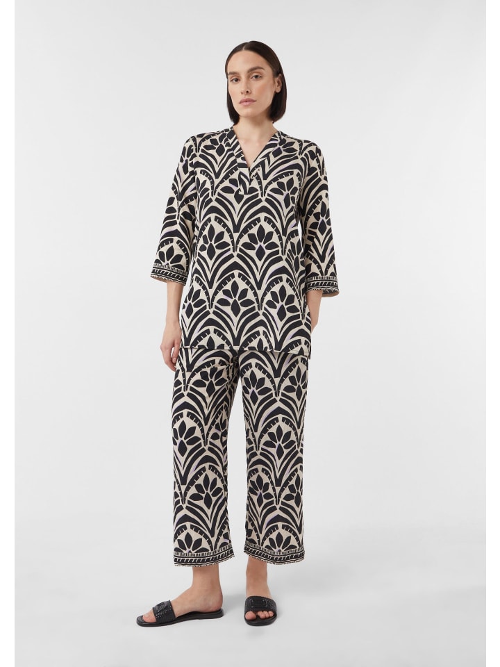 Откройте для себя женственную элегантность в нашей длинной блузке с принтом по всей поверхности. V-образный вырез и туникообразный крой добавят изысканности вашему образу. Рукава три четверти обеспечивают оптимальный комфорт в любое время года. Сочетайте блузку с облегающими брюками для создания стильного образа или носите ее расстегнутой поверх топа. Универсальная вещь, которая обязательно должна быть в вашем гардеробе.