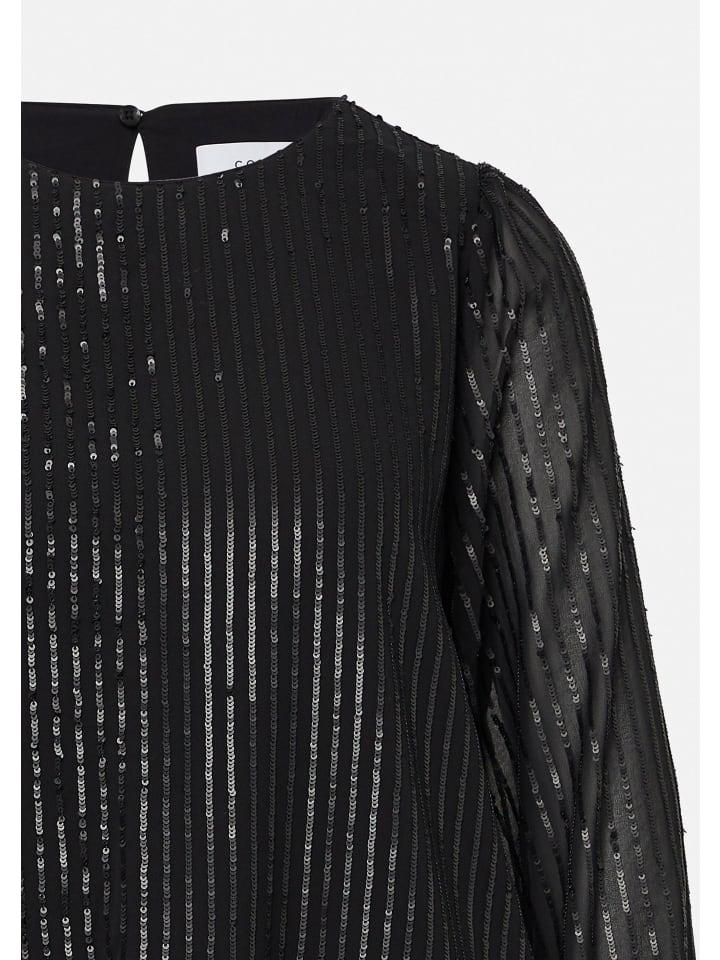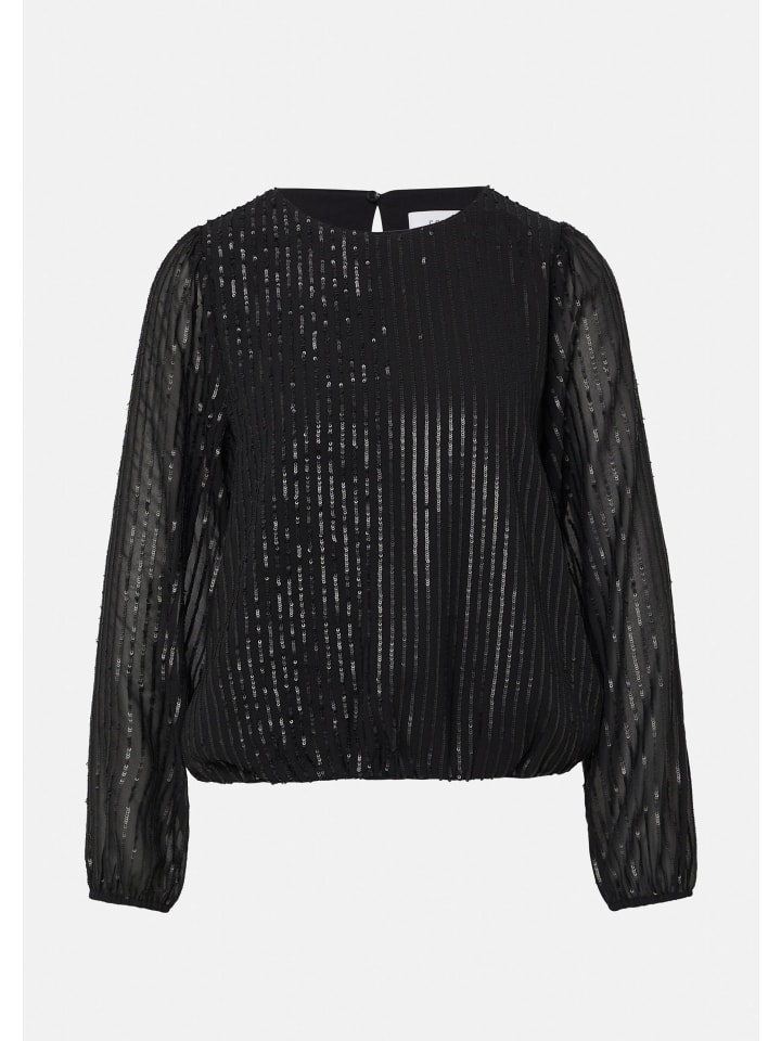 Эта блузка с длинными рукавами очаровывает элегантной отделкой пайетками и круглым вырезом с разрезом. Эластичные манжеты и подол обеспечивают идеальную посадку и комфорт. Универсальная модель, которая будет уместна как в деловой обстановке, так и на празднике. Женственный крой подчеркивает фигуру и добавляет стильный штрих.