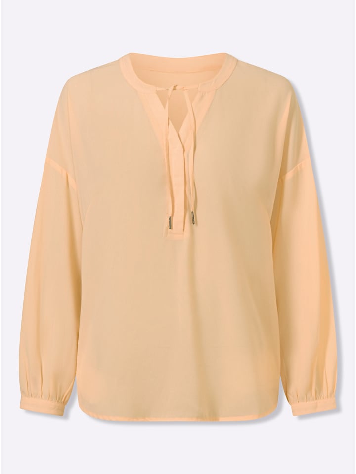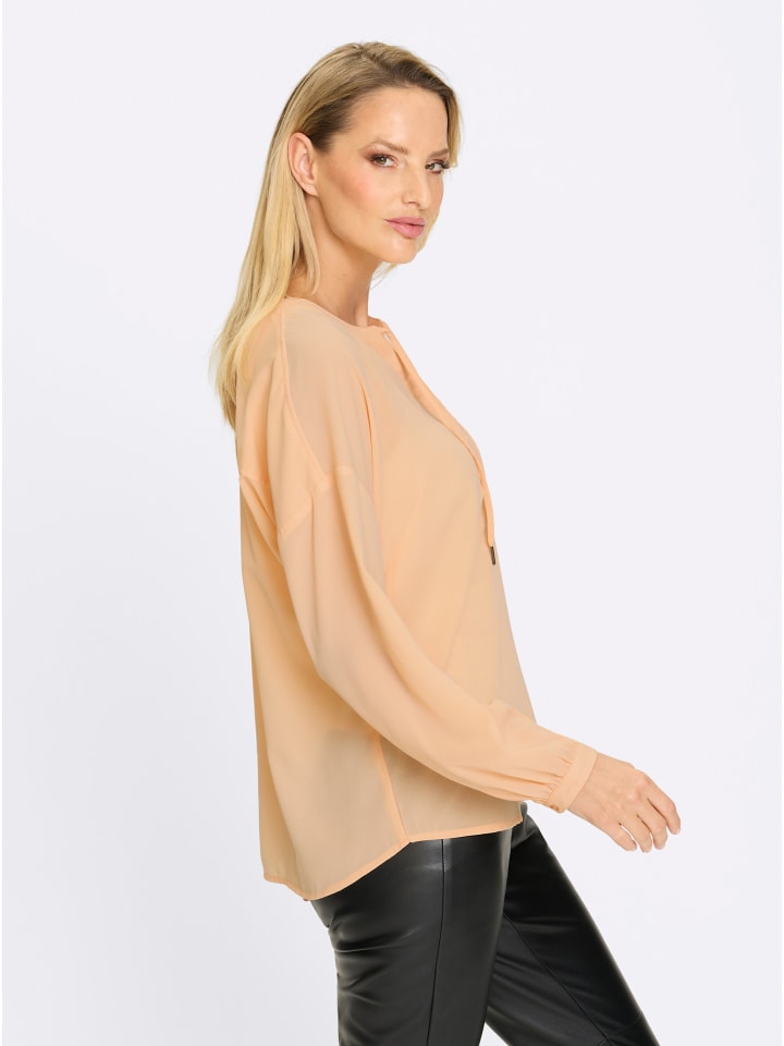 Блузка из легкого в уходе, прозрачного крепа с декоративной завязкой на открытом V-образном вырезе. Короткая потайная планка на пуговицах, спущенная линия плеча и узкие манжеты на пуговицах на длинных рукавах.