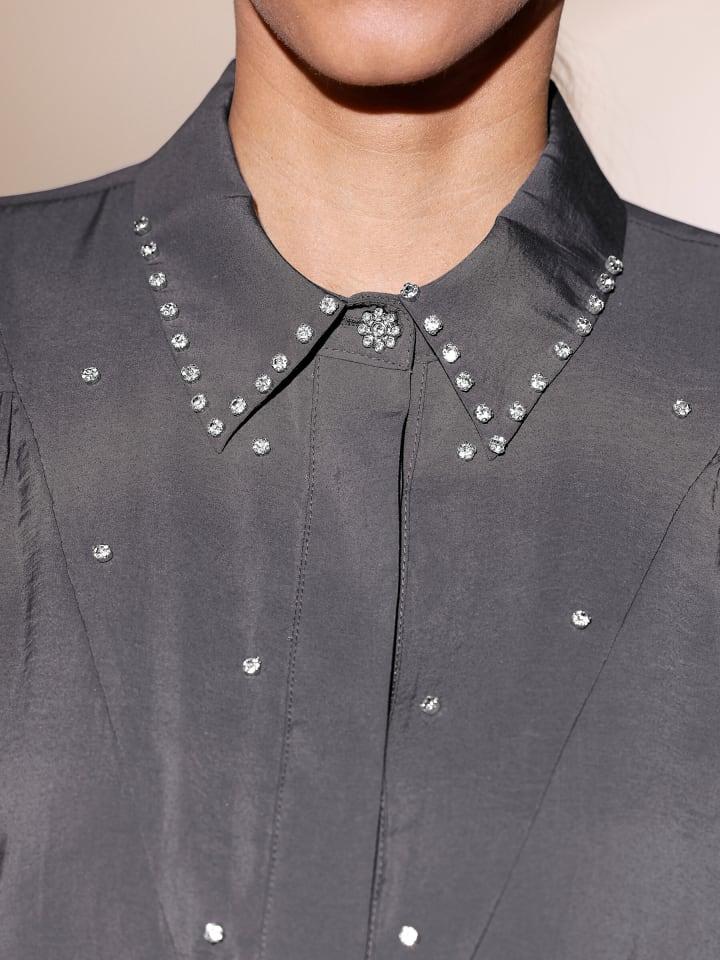 Эта элегантная мерцающая блузка из модала слегка свободного кроя производит ошеломляющее впечатление благодаря широким длинным рукавам «летучая мышь», собранным на кокетке, аппликациям из стразов на воротнике и кокетке спереди, а также сверкающей декоративной пуговице, видимой в верхней части потайной планки. Блузка имеет кокетку, сборку на спинке, закругленный подол и манжеты на рукавах.