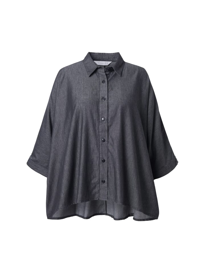 Блузка свободного кроя из мягкой ткани с широкими рукавами «летучая мышь» 3/4 и манжетами. Отложной воротник, планка на пуговицах.