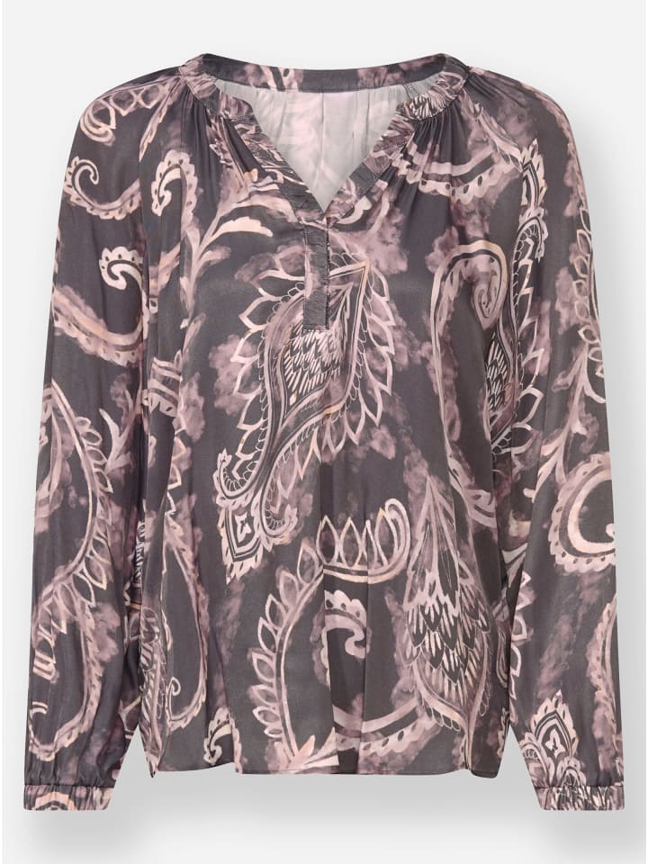 Блузка с принтом. Красиво струящийся, элегантно мерцающий атлас с привлекательным узором пейсли. Круглый вырез горловины с открытым V-образным вырезом и сборками. Длинные рукава с эластичными манжетами.