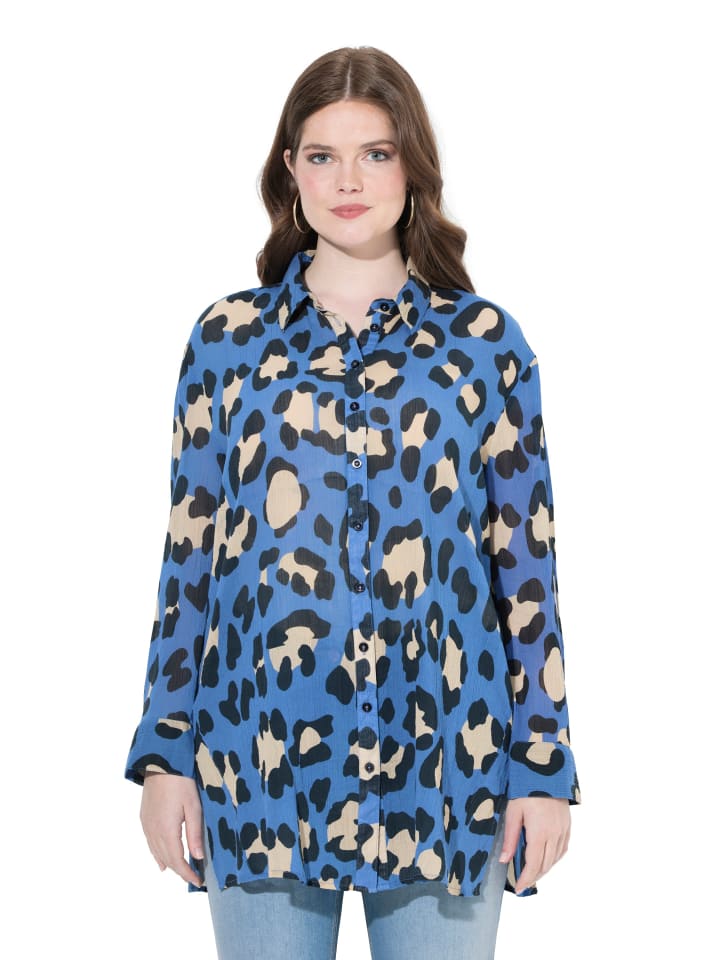 Блузка, удлиненная, свободного кроя, из мягкого фактурного хлопка с ярким леопардовым принтом. Длинные рукава с манжетами и подворачивающейся хлястиком длиной 3/4. Отложной воротник и боковые разрезы для дополнительного комфорта.