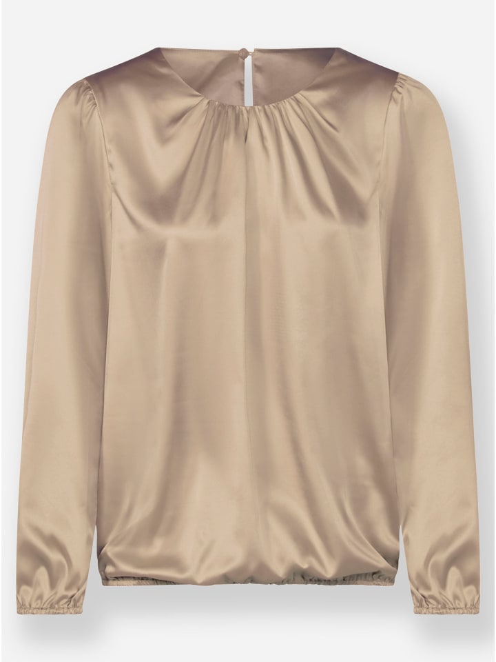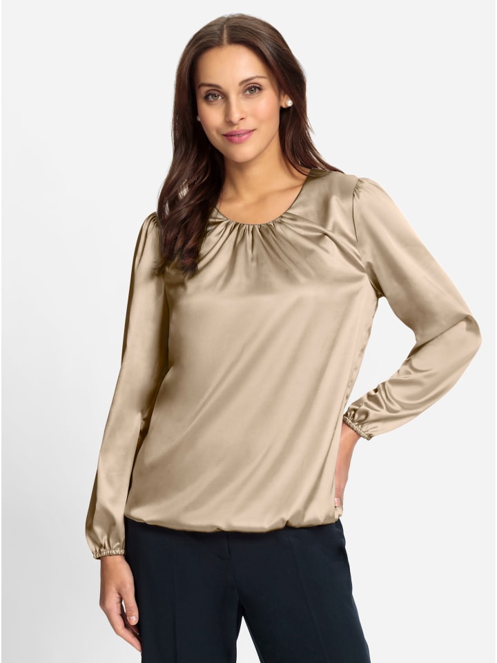 Роскошная мерцающая атласная блузка с эффектными сборками на круглом вырезе и плечах. Застежка на петлю-пуговицу и разрез сзади. Эластичные манжеты на длинных рукавах и подоле создают красивую драпировку. Изготовлено из переработанного полиэстера.