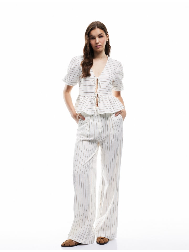 Эта элегантная блузка с V-образным вырезом добавит изысканности любому образу. Короткие рукава-фонарики и завязки создают игривый образ. Изготовленная из легкой смеси льна и вискозы, она обеспечивает комфорт в течение всего дня и достаточно универсальна как для офиса, так и для отдыха.