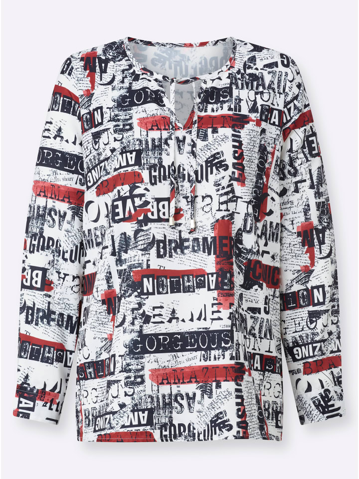 Модный и непринужденный фасон без застежек, воздушный и легкий атлас, а также эффектный принт с буквами - эта блузка воплощает сразу три модных желания. Круглый вырез горловины с V-образным вырезом и завязками. Длинные рукава с манжетами на пуговицах.