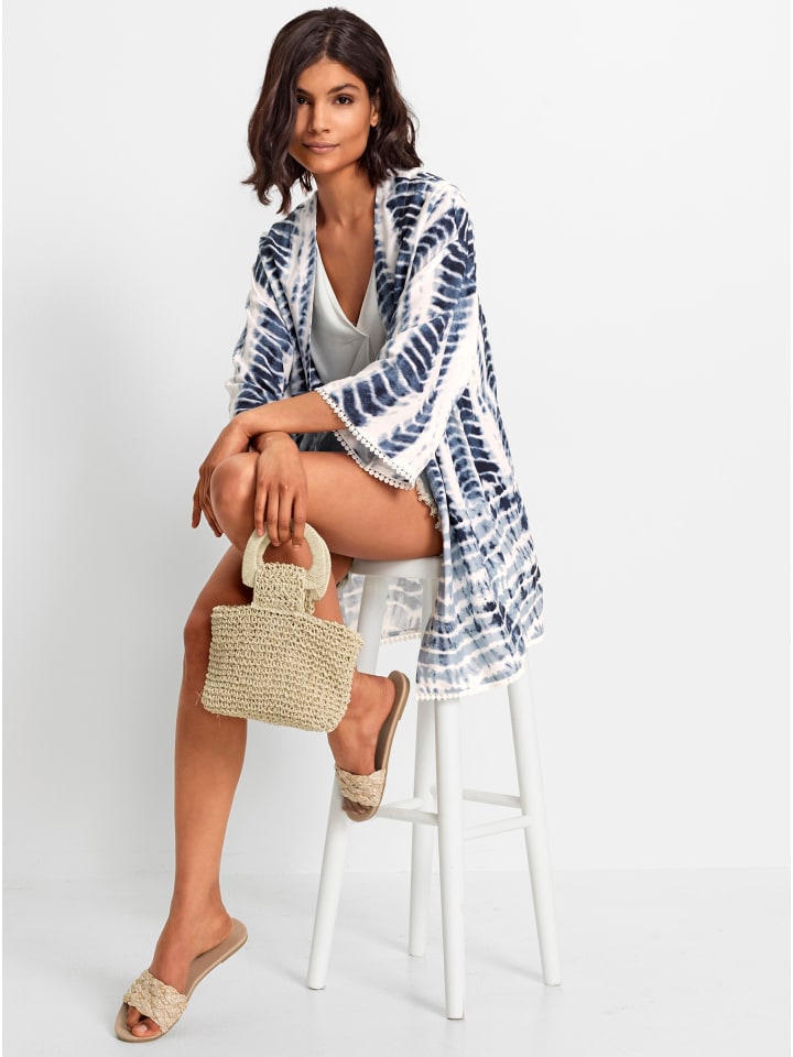 Эта блузка-жакет с гармоничным рисунком в стиле батик словно создан для отпуска. Она имеет свободный, свободный крой с красивой отделкой по краям рукавов 3/4 и по подолу.