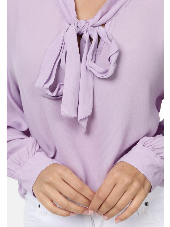 Элегантная женская блузка с декоративным бантом. Эта изысканная блузка выполнена из нежной крепдешиновой ткани из высококачественной вискозы. Тонкая текстура и струящаяся драпировка ткани придают этой блузке особый шарм. Широкий декоративный бант завязывает тонкий V-образный вырез деловой блузки. Длинные, слегка присборенные рукава заканчиваются стильной манжетой с перламутровой пуговицей.