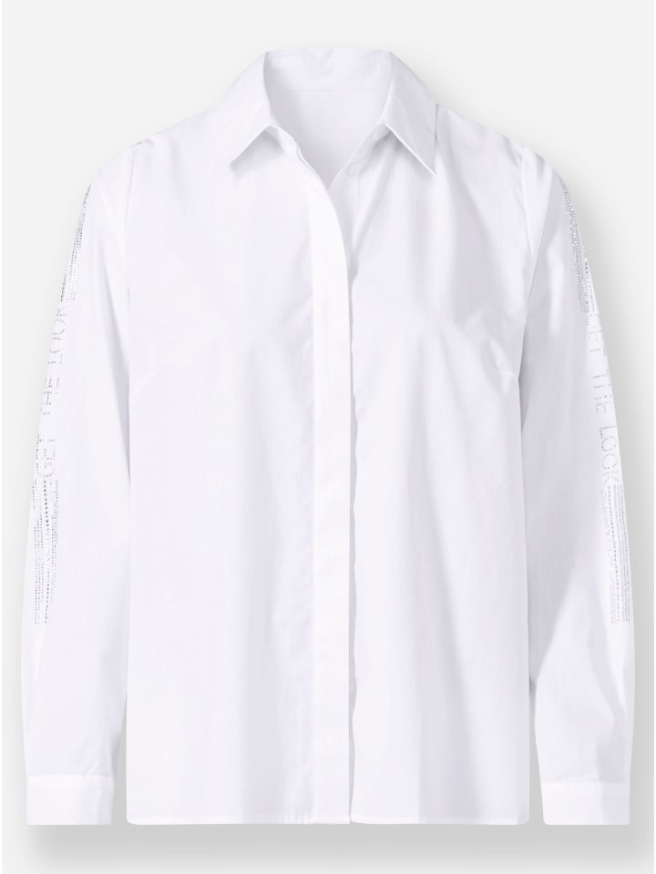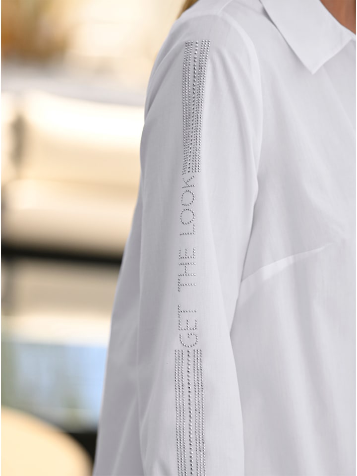 Блузка А-силуэта с рубашечным воротником, потайной планкой на пуговицах и вытачками на груди. Длинные рукава с надписью из стразов и манжетами на пуговицах. Удлиненный задний край. В поддержку инициативы «Хлопок, сделанный в Африке».