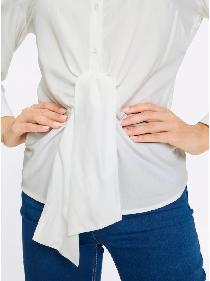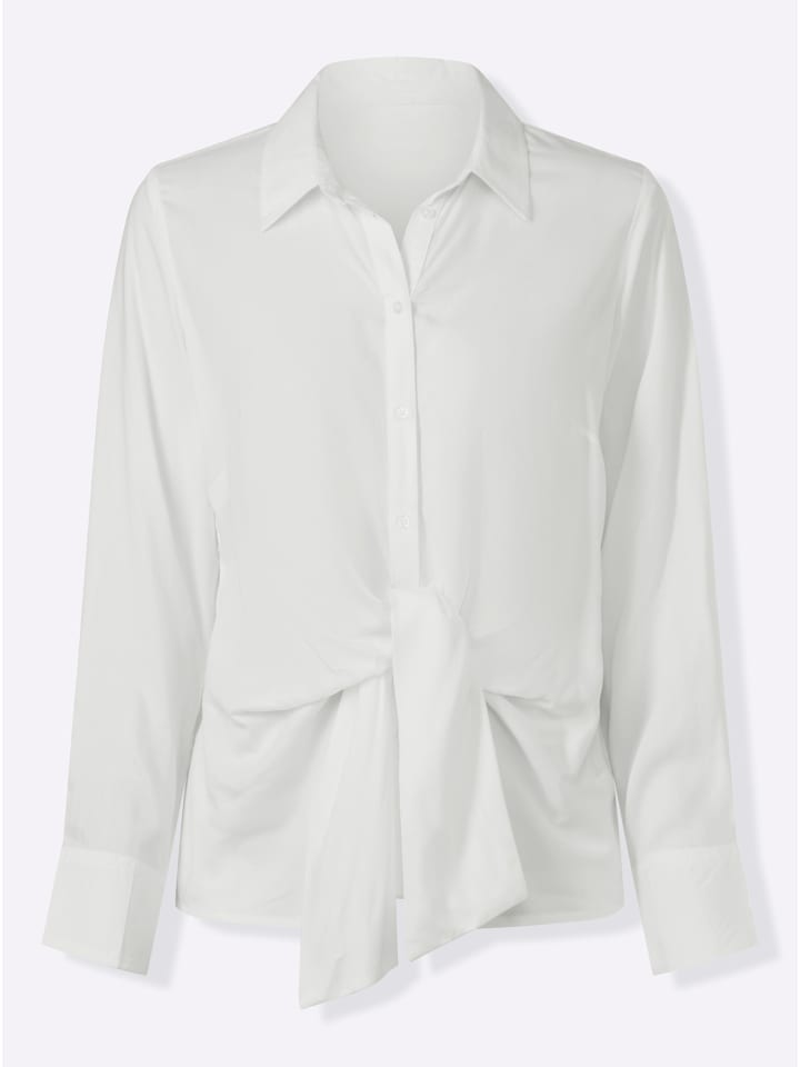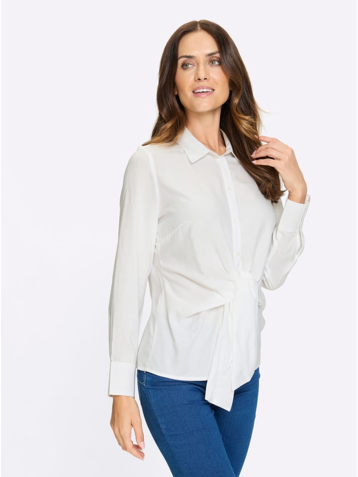 Элегантная блузка со стильным узлом и присборенной линией талии. Слегка прозрачная, струящаяся ткань. Отложной воротник, планка с пуговицами и вытачки на груди. Длинные рукава с широкими манжетами на пуговицах. Вискоза качества ECOVERO от Lenzing.